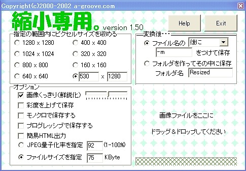 画像を自分の好みの『サイズ』や『容量』に縮小したり軽くしたりするソフトドラッグ&ドロップで簡単に設定したサイズへの縮小が可能。拡大の機能は備えておらず単純に縮小に特化した便利なツールである。