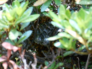 うえで、サツキの枝を押しのけ ハチのいなくなった巣を