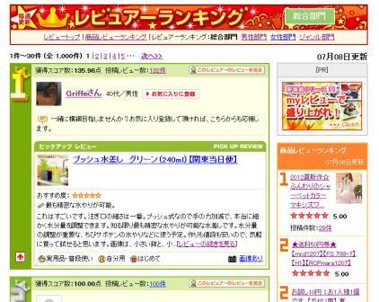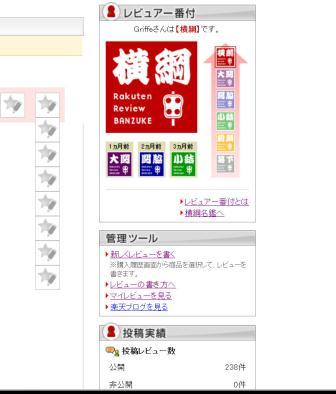前回の記事のとおり、自分でも変に思うほど「一度でいいから横綱になってみたい」と盛り上がってしまった自分。(1) 「ファンの人数」と「役立ったボタン」の条件に阻まれる(2) 一緒に協力して昇進を目指していただける方を探すことを思いつく。(3) 自分と同じ意向をコメントしてる人が居ないか、その時点でのレビュアーランキング1,000名(こっちは一覧なのでチェックが楽)と、同じ番付の関脇(いちいち開いて見るので大変)の「レビューのプロフィールコメント」などをチェックするも、数時間を費やして見つけられずに疲れて断念。(4) 希望者探しは無理せず運任せで続けることとし、同時に、自分から発信して希望者に見つけてもらうことを思いつき、「レビューのプロフィールコメント」、「楽天プロフィール」、「ブログ」にそれぞれ書き込む。(5) 自分から探した経験から、他の人に見つけてもらうのも運任せ。少しでも確率を上げるため、「レビューのプロフィールコメント」をより多くの人に見て貰えるように、レビュアーランキングで3位以内に入ることを思いつく。(6) レビュアーランキングも取ったことがないので下調べ。集計期間1週間内の投稿数が何より重要な様子。商品レビューとショップレビュー合わせて100件も投稿すれば、3位以内に食い込める可能性ありと判断。(7) 数えてみたら、書く気のなかった未記入レビューが150件くらい溜まってた。集計期間を確認し、古くて店が販売を止めている商品まで総ざらいで、1週間かけてレビューを132件書き上げる。(8) ヽ(`Д´)ノ 投稿数132件,獲得スコア135.96点で、見事レビュアーランキング総合1位を達成! とても疲れました・・・。もう二度と取ることはできないタイトルです。気力が出ないし、そもそも未記入レビューが足りないし。〔後述_次の週はトップ184件239点、その次の週はトップ282件306点。私は運が良かったようですね。〕まあ、上位はともかく、100位以内の大半は40~30件くらいだし、1,000位までは30~20件くらいでドングリなので、商品レビューとショップレビューを集中して投稿すれば、たまにランキングに入るくらいなら、そう難しくはないですけど。なんで今まで入ったことが無かったのかが不思議なくらい。 ランキング3位以内で私のニックネームが目立って表示されるのも1週間のみ。たまたま番付昇進に興味ある方がクリックしてコメントを見てくれる幸運に期待します。(´ー`) 興味を持っていただけた方には、前回の記事2012.07.06(1つ下に記載の日記)に示した協力内容などもご覧いただけると、参考になるかと思われます。
