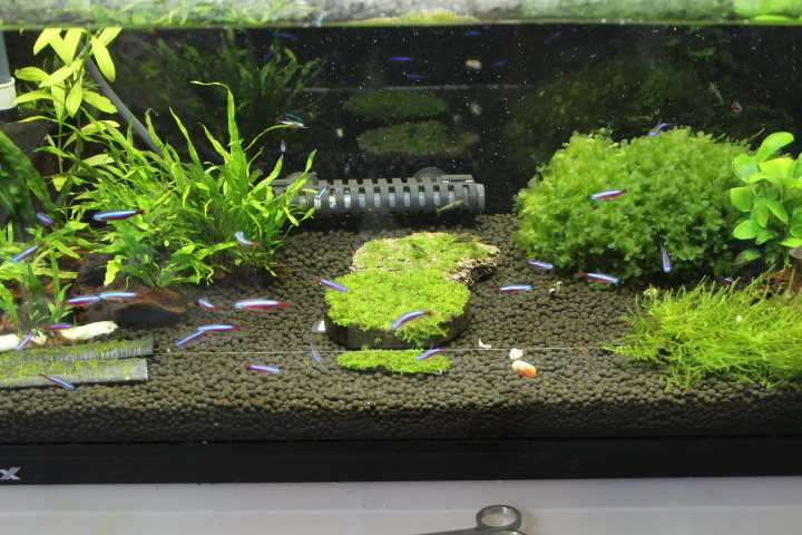 こんばんはいつもいつもですがご無沙汰しております。。。まだまだ寒い日が続いていますが、風邪ひいてませんか?私はハードな仕事と日頃の不摂生のおかげかどうも調子が良く無いです。。。と言っても寝込んだりするような程ではありませんし、仕事も休めませんので何とか乗り切りたいと思っていますさて、なかなかアップしないリビングの水槽ですが、とんでもない事になっておりました過去にもジャングル化しておりましたが、今回は過去最大の放置の為密林と化してしまいました。。。。リビングにある事もあり家族からは非難の声が。。。バリスネリアの勢いが本当に凄いです。そこで。。。。ついにリセット結局髭ゴケが凄かった物やバリスネリア等は全て撤去。何も無いのもかわいそうなのでとりあえず流木付きアヌビスナナ小と竹炭付きゼニゴケのみ投入しました。今日は時間が取れそうだったので朝から始め、途中使いかけソイルが足りず購入しに出かけ、結局夕方までかかりました。。。。今後のレイアウトについてはおいおい考えますが、あまり成長の早く無い物をチョイスするつもりです。ジャングル化していましたが生体はいたって調子が良い様でカージナルさんはほとんど減ってませんでしたリセットを機会に他の子もお迎えしてみたくなりました。今後はまだ不明ですが、変化があればまたアップしますそれではまた~