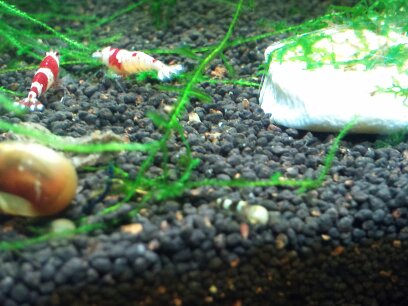 こんばんはいつもいつもご無沙汰しております。先日のこと。。。。いつもの様に明け方に寝ようとしていると突然!グラグラ~!地震です忘れていたはずの阪神大震災の記憶がすぐによみがえりました大声で妻と子供達に布団にくるまってじっとしている様に注意して揺れが収まるのを待ちました。。。うちはマンションの9Fなので揺れもかなりのものでした。一応両親や兄弟にも連絡して無事を確認。特に被害も無く、幸いにも無事だったと思いきや。。。。。。玄関まで来てみると足元が冷たい。。。3本のキューブから大量の水がこぼれておりました中には飛び出してしまったエビまで。。。。あわててエビを救出し水槽へ。その後は必至で床掃除しました。。。本当に地震は怖いですね。。。。エビに関しては地震の影響も無く順調といった所でしょうか混合水槽では順調に稚エビ達が育っております。どれが誰の子か全く分かりませんが、ゴールデンアイ、ゼブラ(タイガー)、ビー柄、良く分からないハイブリまで幅広く産れています。シャドーぽい子も発見出来たのですが、あまりに小さくビー柄なのかもしれません。中でもこの中央の子は赤っぽい感じに白く細いバンドが入っていて注目してますもう少し大きくなればハッキリと見られるのですが、どんな子に育つのか楽しみです。Beeのほうもなかなか順調で、稚エビがかなり見られますwママさんもどんどん抱卵していますし、このまま行けばだいぶ数だけは復活出来そうな。。。ルリーに関しては正直解りません!抱卵もせず、増えも減りもせず、ずっとこんな感じです。。。まぁ、元気なんで良し!としています。。。wかなり温かくなってきましたので、夏までにはもう少し増やしておかねば!!
