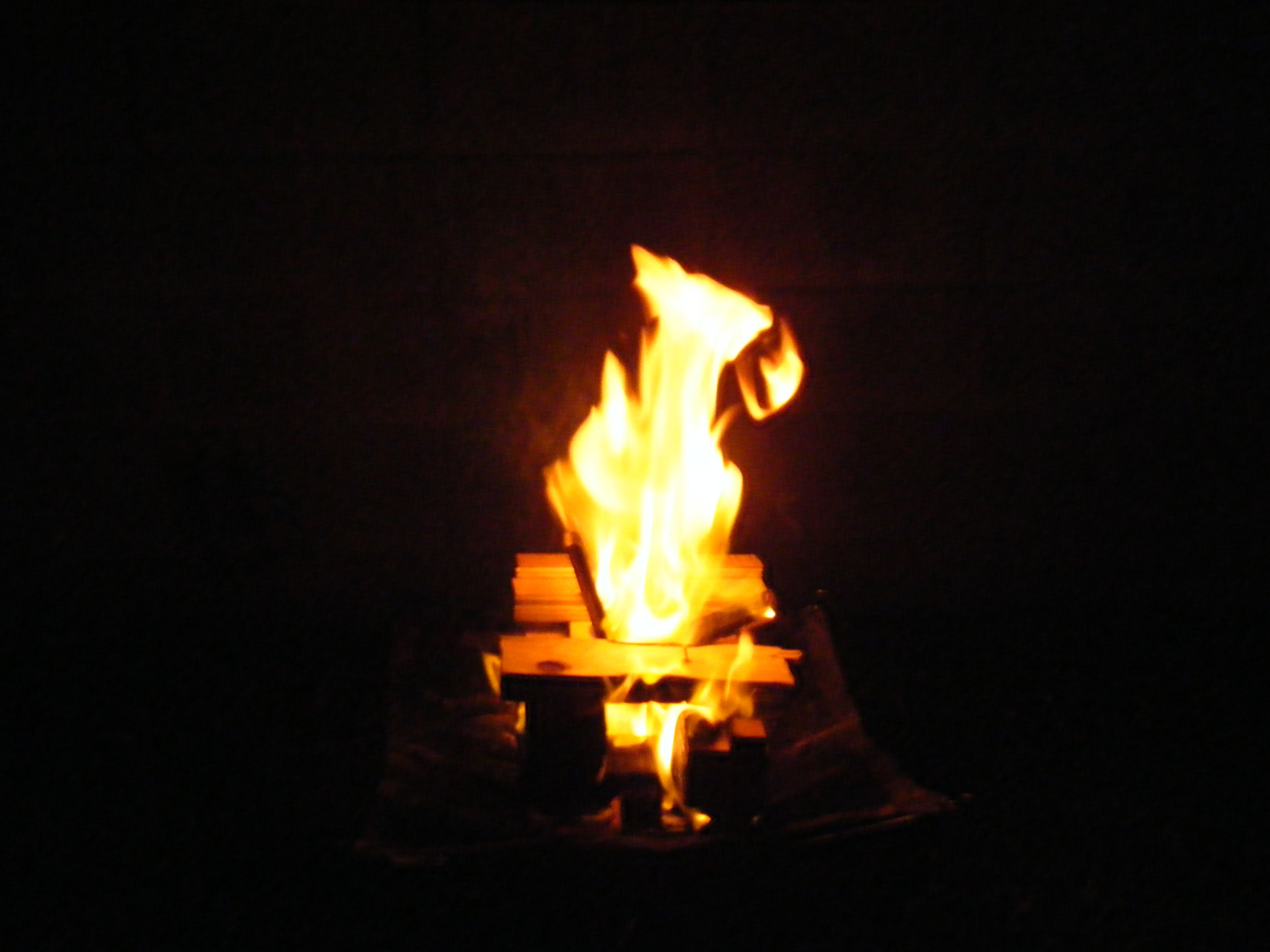午後からの雨も、夜には止んだので、また、軒下で焚火。