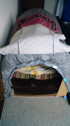 季節の風物詩は数々あれど我が家の季節の風物詩といえばこれ。これは、けんけんのハウスです。無駄にでかすぎる。けんけんのハウス保温用にカバーしまくりこのハウスで、冬は奥の方で丸まって毛布に埋もれて寝ていますが暖かくなってくるとん?何か生えてますよ。アップにしてみます。首だけ出てます~~~~きゃぁああああ~怖いですねぇ~こうやって暖かくなってくると、だんだん頭が出て。手が出て。半分以上出ていたりして(外で寝ても同じ気が。。)そして、その辺で行き倒れの如く寝る様になって来ると本格的に夏が~~~~~我が家の季節の風物詩でした。でも、今日は又ちょっと涼しくなってきているのでさっき2階に覗きに行ったらハウスの奥で丸くなっていました~~~