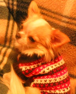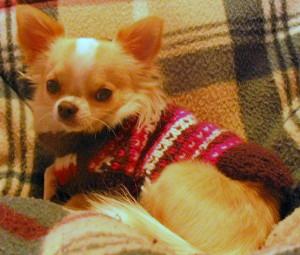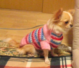 今日は久々に朝晴天!!(関東は雪だったみたいですが、この季節は全く逆ですよね。)モモ、モデルさんになったでしゅ。モモさんとお散歩に40分行ってきました。天気も良く、モモさんも充分楽しみました。その後、少し臭いモモさんの洗濯にサロンへ・・・シャンプー&肛門しぼり&足裏の毛カット&つめきり=2500yenサロンは土曜の精か込んでいて、1時半に行ったのに、モモさんが終わったのは3時・・・その後、実家に行ってきましたが、モモさん超お疲れモード実家でポッキーベルと少し遊んだ後はおねむモード家に帰ってきたのは17時過ぎでした。その後もモモさんぐったりして、超お疲れモード19時、コタツの中で嘔吐物発見!!!どうやら、お疲れモードのモモさん、吐いたみたいです。その後も数回、消化していないピュアロイヤルを吐きました。疲れたのかな??今はあたしの膝でねんねしてます。気持ち悪くなったでしゅ。安静にしてるでしゅ。 小型犬のセーター屋さんBELL新商品UP 本日、新商品をUPしました。母の作ったセーターを7着UPしました。ぐち*の作ったのは今回は含まれません。小型犬のセーター屋さんBELLは コチラ 最近の日記のコメントについては、お返事が出来なかったり、まとめてになっている日もあります。ゴメンネ なるべく皆さんの所には、遊びに行きますね。読み逃げする事も多いと思いますが許してね。 読み逃げ大歓迎ですぅ~♪