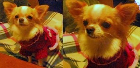 昨日の日記の↓の写真のお洋服モモに一番初めに買ったお洋服です。(今は売り切れです。)ちなみにサイズは3S実は、初めて着た時はこんな感じの着こなしでした。胴が伸びた分、へそ出しになってるし・・・・爆ちなみに、ゆとりもなくて、チビTになってます。笑頭抜けにくいし・・・ワラワラみなしゃん、わらわないでくだしゃい!!! 予告 小型犬のセーター屋さんBELL新商品 明日、新商品をUP予定です。母の作ったセーターを7着UPします。ぐち*の作ったのは今回は含まれません。↑の4枚を含む7枚です。UP時間等は明日、メルマガ飛ばします。メルマガ登録がまだの方、この機会にどうぞ♪小型犬のセーター屋さんBELLは コチラ 最近の日記のコメントについては、お返事が出来なかったり、まとめてになっている日もあります。ゴメンネ なるべく皆さんの所には、遊びに行きますね。読み逃げする事も多いと思いますが許してね。 読み逃げ大歓迎ですぅ~♪