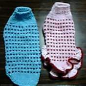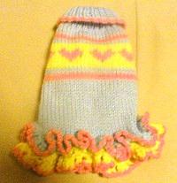 昨日はみなさんに来て頂き、ホント感謝感激雨霰ですぅ~これからも頑張って編み編みしたいと思っていますので、見るだけでも全然OKですので来店して下さいぃ~♪母も編み物が大好きなので、沢山編み編みしてます。(昨日はなぜか子供用の帽子を編んでました。笑)あたしも、どんどん編んで、もっと上手になりたいと思っています。ちなみに、次のぐちのあみあみは、シンプルなふりふりワンピにしようと思っています。こんな感じの(↓)で、首をリボンで縛る感じにしようかな?★セーターの糸と素材について★BELLにて使用している毛糸はワンちゃんの活動性を考えて"洗える毛糸"をほとんどの商品に使用してます。毛100%だと、洗うと縮んだり、洗濯も気を使います。ジャブジャブと手洗い出来るように、アクリルのみ、アクリル+毛 を使用しております。サイズについて、サイズは記載している通りですが、編み方によっては、伸縮性があり、胸周り寸法が多少(1cm~2cm位)小さめでも入る場合もあります。編み方によっては・・・と言うのは、模様編み(縄編み等)が多く入っているデザインについては、模様編み(縄編み)自体が伸縮性のある編み方で横に伸びやすいので、と言う理由です。ぴったりフィットしたセーターの方が暖かそうで良いとお考えの方は多少小さめでも入ると思いますが、普通に着せたい、模様編みのモコモコ感を楽しみたい方はサイズに合った物をお考え下さい。なお、普通のメリヤスあみ(数色モザイク商品を含む)は多少は伸びますが、模様編み程は伸びません。(多少は伸びます)布と違って、伸びると言うのは人間のセーターと同じ意味合いです。人間の手編みセーターをイメージして下さい。洗濯を繰り返ししていると10回位になると、糸も伸び縮みしなくなって、模様編みが広がってきて、幅が少し大きくなる場合もあります。(これも、人間のセーターと一緒ですね)基本的に洗濯はしない(アイロンもほぼ掛けていない)状態での寸法になっています。最近寒くてお散歩に毎日いけないんでしゅ。だから、毎日夜、ママに遊んで遊んでするんでしゅ。ママはモモと一緒に10分は遊んでくれるんだけど、その後は、セーター編んだり、パソコンをいじっていて、相手してくれないんでしゅ・・・もっと、ママに遊んで欲しいんでしゅ~♪いじけちゃうでしゅ。小型犬のセーター屋さんBELLは コチラ 最近の日記のコメントについては、お返事が出来なかったり、まとめてになっている日もあります。ゴメンネ なるべく皆さんの所には、遊びに行きますね。読み逃げする事も多いと思いますが許してね。 読み逃げ大歓迎ですぅ~♪