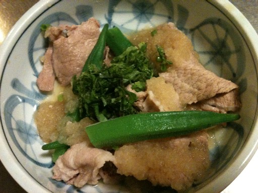 暑さを乗り切るため、敬愛するRねい様の料理を丸パクリしてみました。 大根おろしをたっぷりのせて、豚しゃぶサラダ。さっと茹でたオクラを入れ 醤油+お酢(花菱酢)に、臼杵から送られてきたカボスの絞り汁を加えたタレをぶっかけていただきます。 ワンポイントで上にのせた刻み紫蘇だけが私のオリジナル(笑)これはかなり合いますよ! まだまだ残暑厳しいこの季節オススメの逸品です!