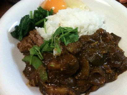 今日はカレーにしました。 生卵に畑のパクチーとさっと茹でたオカノリをトッピング。 スパイスをきっちり効かせてやや辛めに作ったのでパクチーの香りががとてもよく合います。やっぱりパクチーは自家栽培のもののほうが買ってきたものよりも美味しいですね。 オクラを入れたカレーはけっこうありますが、ぬるぬる感が似ている同じアオイ科のオカノリもまたカレーと好相性でした。