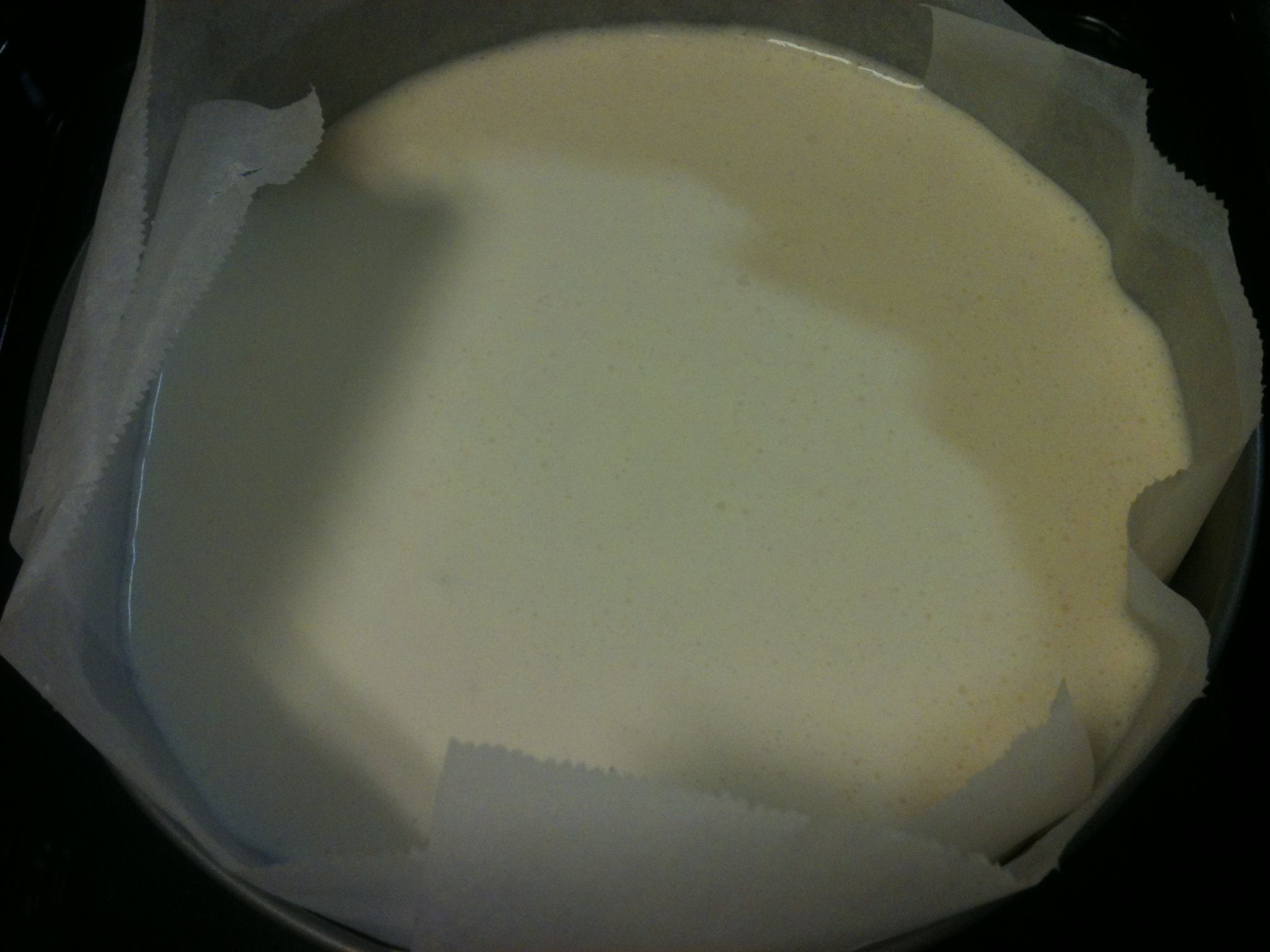 これを冷蔵庫に入れておいた型に流し入れ、型を流しの上で何度か軽く落として空気を抜き予熱しておいたオーブンに入れて焼きました。