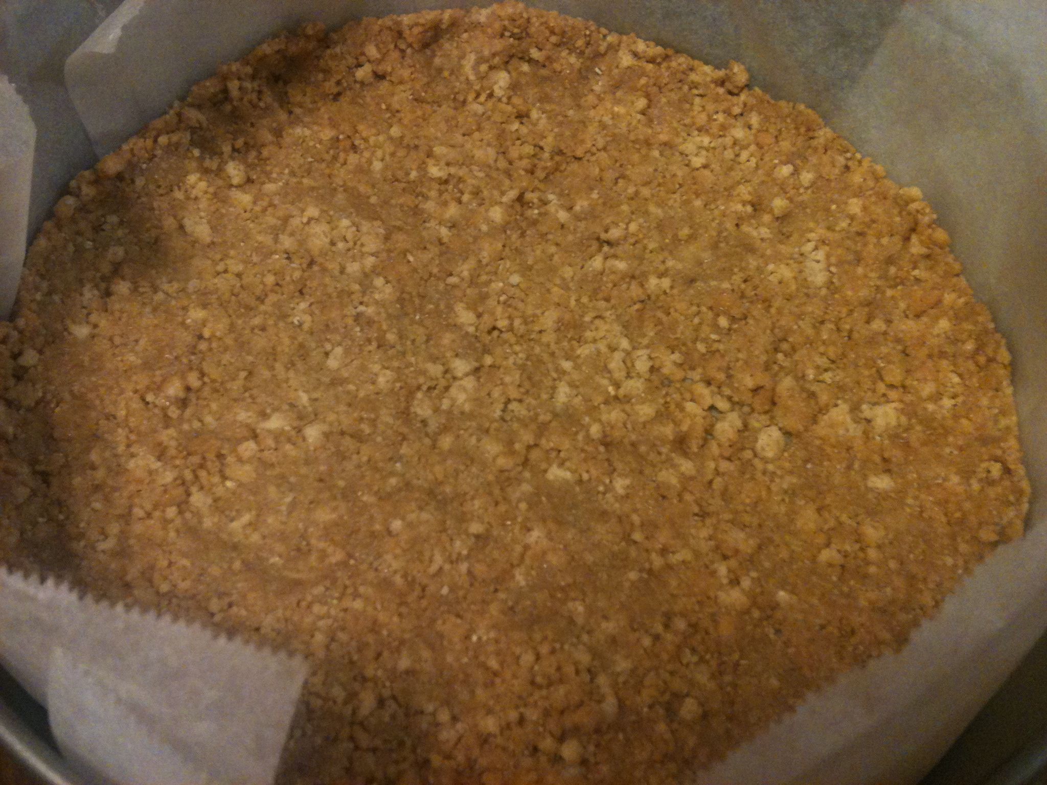 まず、全粒粉のビスケット(近くのスーパーを3件探し回ってやっとゲット。意外と売ってないのね…)を袋の中で粉々にしてバターと混ぜ合わせて型の下に敷き詰めて冷蔵庫で冷やしておきます。