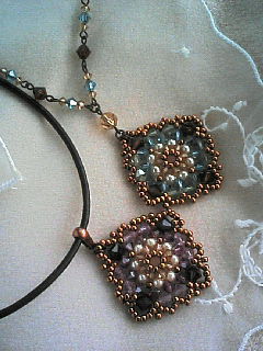 最近ちょっとあわただしくしておりましたプラス 運転中の携帯使用で運悪くつかまり...罰金6,000円&減点1くらっちゃいました~ゴールドの私にとっては初めての経験ッ とりあえずこれから3ヶ月何もなければ減点は消えるそうだけど とってもショックは大きかったですみなさんも気をつけてくださいね~今週はちょこちょこ予定があって外出する機会が多かったんですが バレー仲間のIさん! 彼女もビーズをしているけれどモチーフを主に作っているんでアクセサリー系はどうも苦手らしくって 彼女の知り合いからのネックレスの依頼を私の方に持ってこられたんですとりあえず今までに作った作品の写真をを何点かメールで送って... で、ネックレス8点依頼が...思ったより多くてびっくりッまぁこちらは委託販売先よりも収入になりそうなのでいいのですが これから大変だぁ!そんな時 委託販売先からは修理やサイズ直しもありネックレスやイヤリングを何点か持ってきて欲しいとか そこのアルバイトの人からも個人的に頼まれ... なんだか依頼ラッシュでめまいが上手い具合にさばけるかしら?!とりあえず今日は雨も降っていたし 足りない材料を頼んだので 少しビーズすることに。あぁ~ 雨が降っていたせいか画像が暗くって色がでてない~ッこちらは 上のは昨年の秋ごろに作ったもので お気に入りでよくつけていたネックレスです。今回は手持ちの皮ひもに付けたいとのことでトップのみを作りました。スワロはバーガンディとローズサテンとLt.アメジストとLt.co.トパーズを使ってます。ピンク系ですがなかなか好きな組み合わせですどんなのにつけるのかわからないので 合うかどうか心配。まぁ合わなかった時はまた考えよう!明日からの一週間もずっと曇りか雨らしい...早く梅雨あけてくれないかしら...