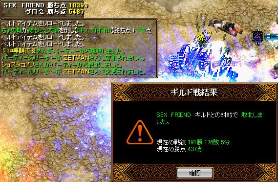 前回に引き続き死ぬほど強かった!!そもそも今日金曜日なんですよ!明日試験なのに全然勉強できてなくて焦りが高まる余り気付いたら6時でやばいギル戦入れなきゃってなってなんかいれてしまいました!ここんとここんなんばっかです。その割りにみんな集まってくれたし、勝たせてあげられなかったのは残念だったけどSEX FRIENDさんに迷惑をかけることにならなくて良かったです!さてさて中身のほうですが、多分BISさんとWIZさんは一人ずつだったと思うのですが、ドラツイがほぼ完封されました。その理由としては、BIS不足によるしょっさんの2PT目への移動と僕の指示ミス、それとくまのみさんを始めとするシフさんやドラツイさんのやばい火力が挙げられると思います!しょっさんを始めから1PT目に入れてずっとBISさんをつけていたら、失点は同じでも得点は変わったんじゃないかなーと・・・霊術師がいたらそりゃー一番いいんですが、やっぱ力対力もしくは頭!そこにあこがれますよね。もうお気づきと思いますが今日も先生居なかったので、居たら勝てたなんてあほなこと言うつもりはないですがフルパワーで戦えなかったのが残念です・・・先生もくまのみさんと戦えると知ったらすごい喜んだろうになぁ・・・というわけで今日も惨敗でしたが、これも10時代の洗礼として(9時台でやっていくっていう話は気付いたらどこかにいってしまいました)心のどこかに悔しさを永久保存しておきたいと思います!次は完璧な作戦を立てて、綺麗な連携で高速パスギル戦をします!あとSSはいつもの通り結果しかありません!SEX FRIENDさんありがとうございました!