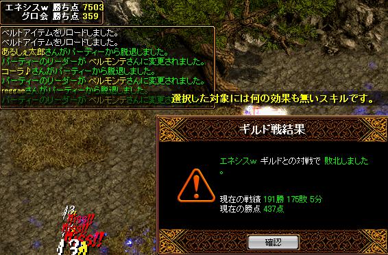 いやーーーー強かった!!あまりに強すぎてSSありません!何はともあれBISさんとWIZさんたち(どっちも3名くらい?)の守備がイタリアのカテナチオを彷彿とさせる網の目包囲網で、ドラツイに頼り切っていたグロ会にとってまさに天敵!結果から見るとB&Gさんとやった時と同じ感じの完封負けでした・・・コーラさんの力をうまく活かせなかったのも敗因です・・・ごめんみんな!だけど初めて?みんなが意見を出し合ってギル戦中に作戦を色々変えたり出来たのは楽しかった!今度は実を結ばせよう!エネシスwさんありがとうございました!