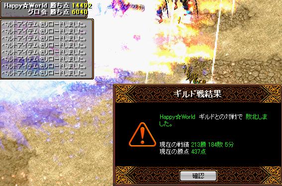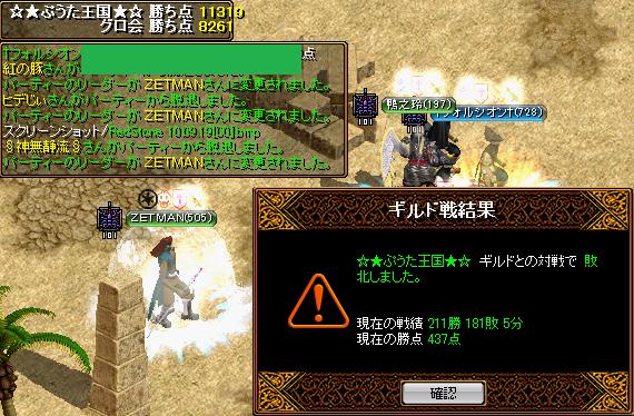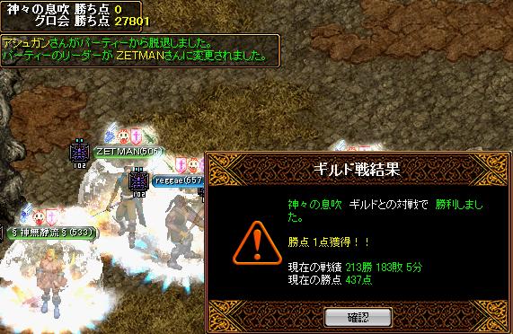 こんばんは、ZETMANです。今日は先生がバイトで居なかったので僕が代わりに書きます。本日のお相手は鷹の団さん!こちらの参加はWIZ1 天使1 BIS1 アチャ1 シーフ2 武道家1 霊術師1 (剣士1)の9人で、武道家ソロの他1PTという陣形でした。鷹の団さんは昔から名前を聞いていた方がたくさんいて、皆さん高レベルだと思うので作戦としては絶対失点しないようにしようと言っていたのですが、開始早々僕が10秒近くラグってデュオさん(654)を失うことになり、そこからRさんとバルさんが倒れ1162対0という絶望の中、作戦をひたすら攻めてチャンス待ちにかえて粘ること数分なんとか一人倒すことに成功し、そのまま雪崩れ込もうと思ったのですがすぐに立て直されてしまいました。しかしここで相手の天使さんが一人消えて、もう数分粘ると逆転!!正直なところラグでデュオさんを死なせた時点で、やり場のない怒りから僕のモチベーションはがくっと下がっていたんですがこの逆転は嬉しかった!ただデュオさんがBISさんにまさかのパラ全ミスを記録したりと色んな意味で彼の記憶にしばらく残り続けるギル戦になったことでしょう・・・鷹の団さん、対戦ありがとうございました!