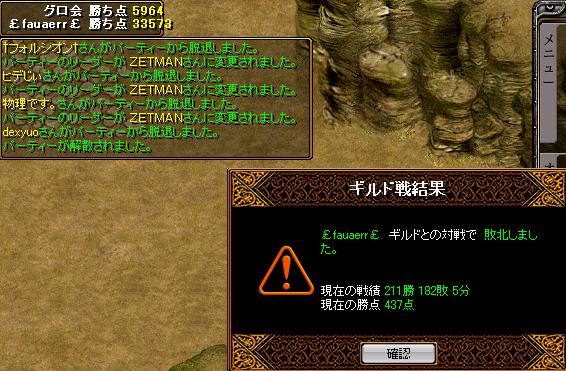 こんばんは、今日はZETMANです。そして本日のお相手はfauaerrさん!人数がすごかった・・・こちらは9(8)人で相手は18人!コーラさんや先生やバルさんが色んな事情により参加出来ず、ヒデさんがBISで動けない中れげさんが一人で相手ギルドさんのメンバー半分くらいからありとあらゆる足止めを食らっていて、その後は・・・もうどうしようもありませんでした・・・れげさんごめん!また、最初アシュガン(150くらいの花特化プリ)が参戦していたのですが、開始早々一瞬で死んだため帰ってしまいました。抵抗の下がるマップで相手は大人数だったので、何度殺されたとしても花投げを試す価値はあったと思うのですが、それが心残りです。そんなわけで、またいつかぜひリベンジさせていただきたいと思います!レベル差はあんまり無かったと思うのですが、如何せん人数差がどうしようもなさすぎたのでしばらく先になってしまうかもしれませんが・・・その時は宜しくお願いします!£fauaerr£さん、対戦ありがとうございました!