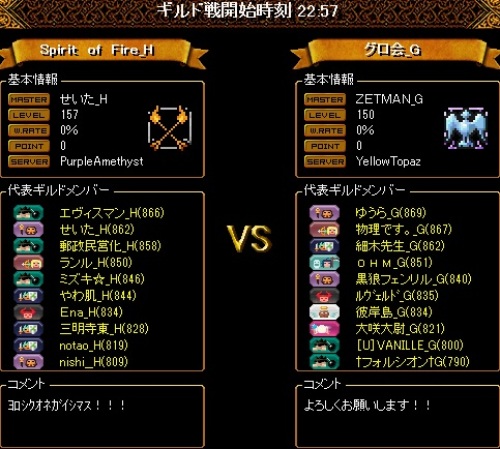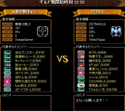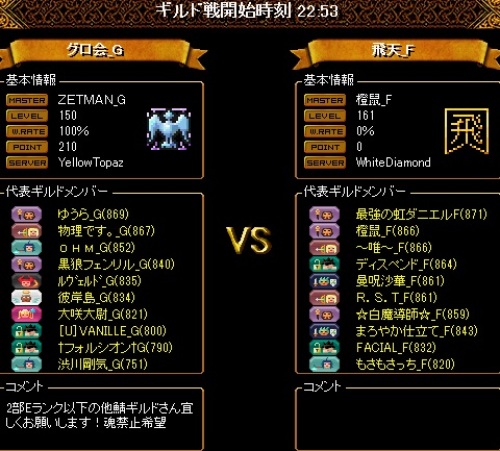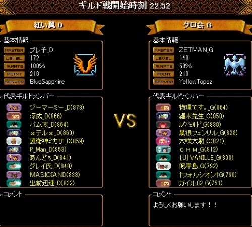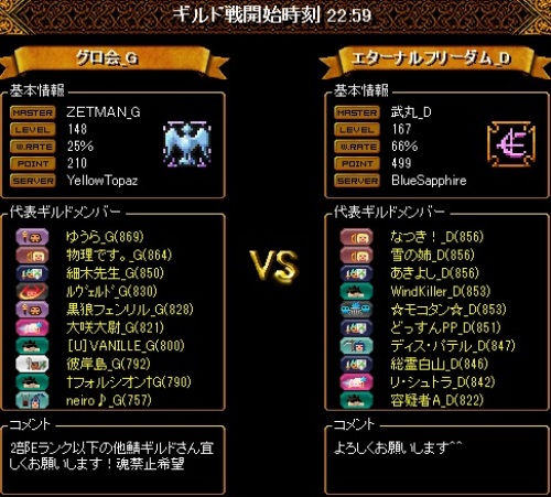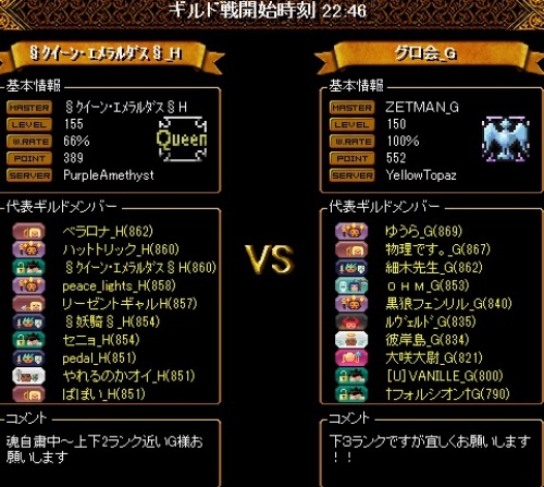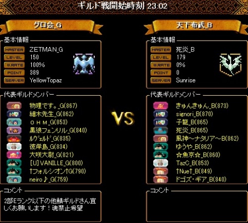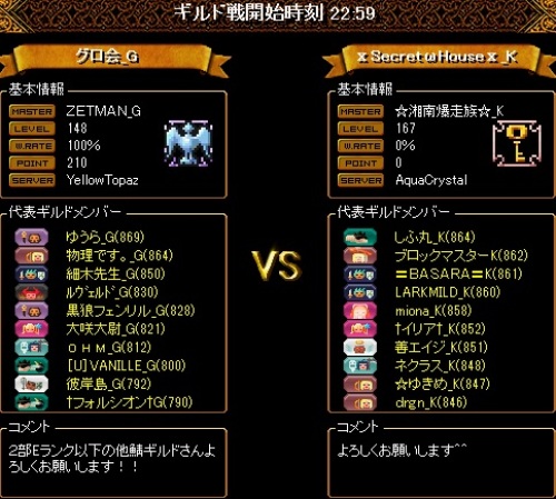 悲しみを乗り越えて・・・。頑張っていこう。TRS指なんて無かった。アリーナランキングは【2部D】のようです。相手集まり:11人(悪魔0・霊術0)味方集まり:13人こちらまたまた1火力。相手様はWIZの層がとても厚かったので、僕の攻撃だけじゃとても落とせる気がしなかったです。事前情報にて、めちゃくちゃ痛い雨さんがいることは知っていたのですが、序盤雨降ってなくてラッキーと思っていたら、序盤は物資準備等をしていたのか、次に衝突した時にはガンガン痛い雨が降ってきたのでたまらず水PをONしました。おそらく水Pを所持している人は全員ONにしたのではないでしょうか・・・素の状態だと、僕で430ダメ喰らいました。最初の衝突で、相手様天使の枚数が1~2枚ということがわかり、うまく孤立したところを落とすことに成功し、そこからは主導権を握ることができました。相手雨アチャさんを腕で封じることができていなかったら厳しかったかと思います。Gv後に耳が来てわかったことなのですが、相手様は今回で黄鯖4連戦となってしまったらしく、それを知らずに後入れしてしまい大変申し訳ありませんでした。他の黄鯖Gさんはしばらく後入れしないようにすると良いかと思われます。って流石にお節介か。対戦ありがとうございました。~書きたくなかったけど追記~こっちが我慢してれば綺麗サッパリ今回のことは終わるかと思いましたが、流石にしつこいので反論させていただきます。まず・・・反論の前に、相手からきたSSを全て載せます。まずそもそも・・・。Gvを入れていない僕に言われても・・・。まぁ、これはグロ会の戦績を書いているのが僕だから、僕に耳してきたってことで納得はしていますけど・・・。GM居るって聞いてきたから居るって言って名前まで言ったのに、何故僕への耳が続いたのか。そこは不思議でした。それはいいとして。僕は先程も言った通りGvを入れていないので、この耳が来た時は、ああ、ランク上下2つまでのG様後入れお願いします。とか書いてたのかな。悪いことしちゃったな。と思っていました。一番上のSSを見てみればわかる通り、実際に書いてあるのは、上下2ランク「近い」Gと書いてありますね。3ランク下のグロ会は2ランク「近い」Gに該当するのではないでしょうか?何故その点についてずっと言われ続けなくてはいけないのかがわかりません。また、黄鯖4連戦と聞いた後に調べさせてもらいましたが、4戦の内2戦はそちらが黄鯖Gに後入れしているじゃないですか。先入れ→後入れ→後入れ→先入れですよね?黄鯖と連戦したくないのでしたら、3戦目の気楽堂さん(勝手に名前出してごめんなさい)の時に、後入れしなければ良かったのでは?調べれば調べるほど、ただいちゃもんつけたいようにしか思えません。更に調べてわかったことなのですが・・・。もしかして黄鯖4連戦じゃなく3連戦ではないですか?戦績見る限り、4連戦じゃなく3連戦にしか見えないのですが・・・。いよいよいちゃもんつけたいようにしか見えなくなってきました。1戦目おやつさん、2戦目気楽堂さん、そして3戦目がうちですよね?そうなりますと・・・おやつさんと気楽堂さんにはそちらが後入れしていますよね?そちらが自分の意思で黄鯖2連戦を選んでおいて、3回目に黄鯖から後入れきたら怒るんですか?もし反論するのなら、耳の内容と矛盾しない形でお願いしますね。僕の聞いた感じでは、・黄鯖が入れてきたから言っているわけじゃない。3つランク下なのに入れてきたからコメント無視して入れてくるなと言っている。・クレームじゃないと言っているけど完全にクレームだよねと捉えています。ですので、それについて僕なりの反論を書かせていただきました。コメントにも書いたけど、GMじゃないのに疲れました。もう二度と後入れしませんので許してください。黄鯖連戦にさせてしまい申し訳ありませんでした。ZETMANです。すみません、ギルド戦後にもメンバーから話を受けましたが、遅ればせながらSSやコメント等を拝見し、正式に自分から説明させていただきたいと思います。本日は朝7時頃に先入れし12時前に確認に戻ったところ、まだ組まれていなかったので同じ境遇だった§クイーン・エメラルダス§様のコメントを見、ここでいう上下2ランクとは、上すぎて勝負にならなかったり、下すぎてすぐ終わってしまったり等という状況を避けるための方便だと考え、このままでは本日ギルド戦がお休みとなる可能性も見えていたので、当方3つ下ながらも挑戦させて頂きたいと思い後入れに変えました。直近で黄鯖と2連戦していたのを見落としたのは自分のリサーチ不足でした。以後§クイーン・エメラルダス§様に対してはコメントに1%でも合致しない部分がある限りは対戦を控えるように致します。誠に申し訳ありませんでした。