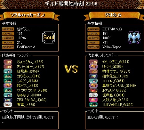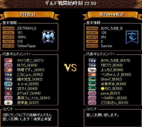 アリーナランキングは【2部E】のようです。リベンジ戦かな?とにかく久々です。相手集まり:2PT(悪魔1~2、霊術2~3?高スキル有り)味方集まり:16人終わってからの率直な気持ちを言うと、喉がからっから。炭酸飲みてぇ。でした。つまりそれくらい集中力が要求される一戦でした。長らくシフ武0でGvをやってきましたが、今日になってフォルヴァニカップルが復活!!どちらも本当に数ヶ月Gv出てなかったのか?ってレベルの活躍を見せていました。鯖全体として特徴を捉えるのは今まで嫌いだったのでG単位でしか特徴を捉えないようにしていたのですが、もうこれは捉えざるを得ませんね。赤鯖の霊術さんの人口と質は異常!!相手様の主な戦術は、真空orブレイズで出鼻を挫いてからの戦闘で、アドバンテージを得てから交戦スタートって感じでしたね。序盤は相手様の妨害のはやさについていけず、あたふたしているうちに失点。それもここ最近は全く死んでない人から落とされたので、この試合は孤立した人からやられる・・・と思った瞬間でしたね。こちらも天使さんを落とすことに成功し、更にシフさんを落とすことに成功し、逆転に成功しますが、またすぐに逆転され・・・。シーソーゲームの開始。そして僕は今、やってはならないことをやってしまったことに気が付きました・・・。夢 中 に な り す ぎ て こ こ か ら 終 盤 ま で う ろ 覚 えGv戦績を書く者としてやってはいけないことですね^^;;;後で動画見直してみます。。。覚えてる限りを箇条書きで書くと、・中盤、1天使が檻真空で捕まり、壊滅の二文字が見えるもなんとか2PT目でカバーして被害0・ブレイズが交戦してる時常に来てた気がする。ヘイおねしかいってないw・中盤、何からスタートしたか忘れたが、一気に数人倒すことに成功し、大きく差が開く。・終盤、相手様の戦術を流石に把握し、置き真空からのカウンター狙いで簡単にアドバンテージを得られないようにする。結果、流石に狙いはバレバレでそこからの得点もなかったものの、相手様も攻めあぐねてた(気がする)ので、作戦としては成功だったと思う。そんな感じで、なんとか勝利!全体の反省点としては、相手様は連携中心に得点を取ってくるスタイルだったので、孤立したらほぼ狩られてましたね。狩られないとしても、あと数秒コルが遅れてたらorソウルガード無かったら死んでた。みたいな。いい刺激になったのではないでしょうか!自分の反省点としては、アチャだからって移動速度なめてました・・・。快速疾走は流石に積む余裕無いかもだけど、移動バッジすら捨ててちゃダメだ・・・。早く872にしないといけませんね。最悪他を捨ててでも移動バッジを取りに行くか・・・?対戦ありがとうございました。
