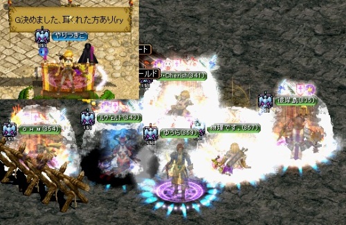 こんにちは。とうとう待望の火力さんがグロ会に入ってくれました!!職はアチャ!!そして僕よりレベルが高いっていう超大型新人!!そして未だにレベルを上げているという意識の高さ!!これは期待ですわ!!!ってことで、改めてメンバーを見てみると・・・。偶然なのかなんなのか要職が揃っているわけですよ。地底湖狩りの。職編成を言うと、BIS、WIZ、霊術、ネクロ、知識アチャ、物理アチャ×2写真に表すとこんな感じ。(狩り終了後に集合SS撮ったんだけど、やりさんが途中で果ててしまったためこんな感じに・・・)まぁベストとは言えないけど地底湖狩りは十分いける編成。まぁ物理アチャの一人が知識になればベストなわけですが・・・ってことでプライドを捨てる時がついにきた・・・どうも物理です。改め知識です。(゜_゜)