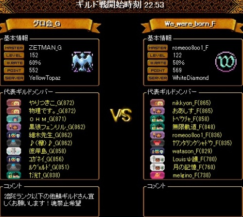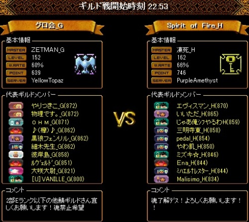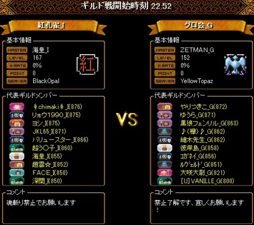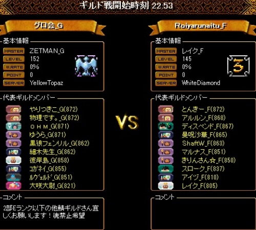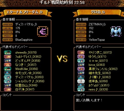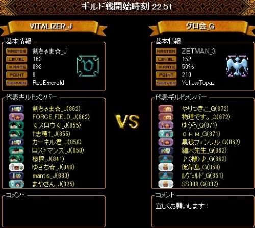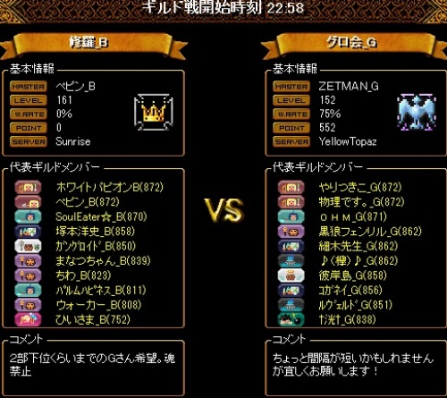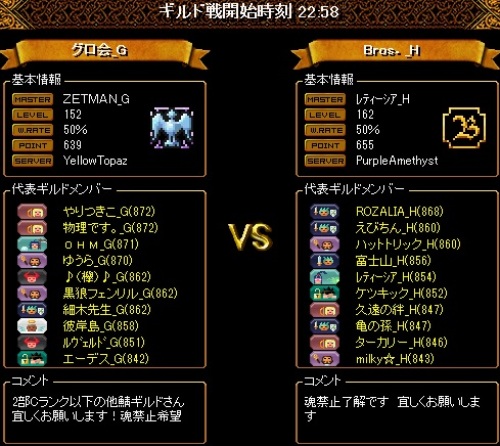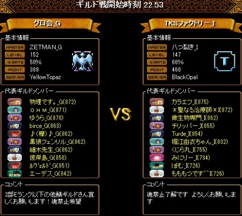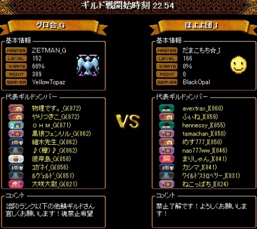 --------はじめに前回の対戦記事で、ほよよ団様の名前で当ブログにコメントされた方はすぐに、おそらくいつも中身のないコメントをして頂いているso-netドメインの方ではないかと推察をつけていたのですが、代表メンバーと結果は今や誰でも入手できる情報であり、仮に本当に関係者からのコメントだったとしても、こちらがほよよ団様であると確証の取れる方から削除を要求されない限りは掲載を続ける方針であったため、記事もコメントも削除せずに放置しておりました。そのしばらく後、件の書き込みを見たほよよ団GM様が当ギルドへ直接、ギルド内で確認したところ書き込みをした事実はなく、ご迷惑をかけて申し訳ありませんでしたと謝罪にいらしてくださり、グロ会側の不徳である事も伝え解決し、その時点で事実を公表しコメントを削除すべきと考えていたのですが、自分の中で処置したつもりですっかり忘れてしまい、問題のコメントを見た方の中にはほよよ団様に対して事実と違ったイメージを持ってしまう可能性を与え続けていた事を、この場をもって謝罪させて頂きたいと思います。ほよよ団様、長い間ご迷惑をおかけし誠に申し訳ありませんでした。ZETMAN--------申し訳ありません。大事な文が書かれているのに更新さぼりまくっていました物理です・・・戦績の自動化による影響で、グログの存在意義が分からなくなってきて書くモチベーションがかなり低下しているので、5代目を探して引き継ぐか、手抜き更新のまま続けるかになるかと思います・・・たまにネタができたら載せるかもしれないけどね!対戦ありがとうございました。