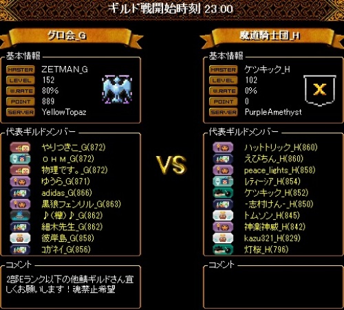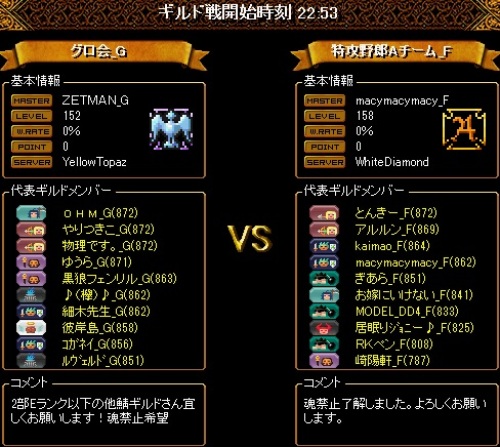 こちらの集まりは19名で、火力は本日から加入した方を加え合計4人、霊術さんも一人復帰して合計4人というしばらくぶりの大軍で、予想と大きく違った展開になってしまいました。前回はだいぶ前のお手合わせでしたが、その時は優秀な霊術さん、悪魔さんが掛け算の活躍をされていて完敗を喫しましたが、今回お相手方には霊術さんも悪魔さんも居らず、ベルセルクを使っても尚死にかける場面もありましたが、辛うじて耐えて試合終了でした。対戦ありがとうございました!