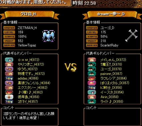 本日の揃いは珍しく綺麗な円形配置だったので撮ってみました。これに天使2人を加えた18名で8・8・2の陣形。dream~夢~さんはランクが近いのですが最近は全然対戦する機会がなく、本日はとても楽しみでした!試合としては、裏切りを食らうのが多かったり2PTの足並みが揃わなかったり、まずい形での失点をしたりといくつか粗はありましたが、天使さんを止めてからの打ち合いで優位に立てていたことが終盤の点差につながりました。対戦ありがとうございました!
