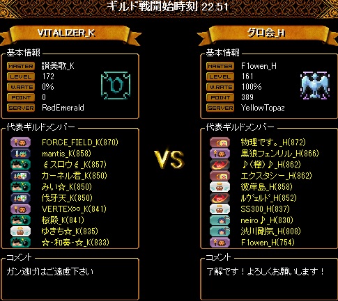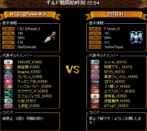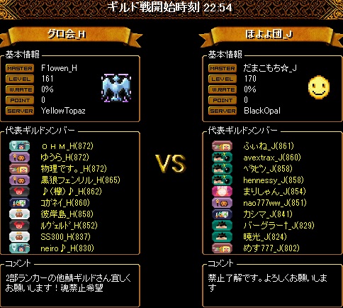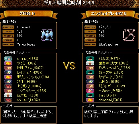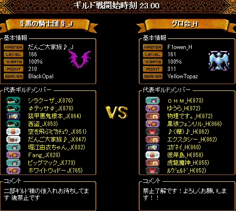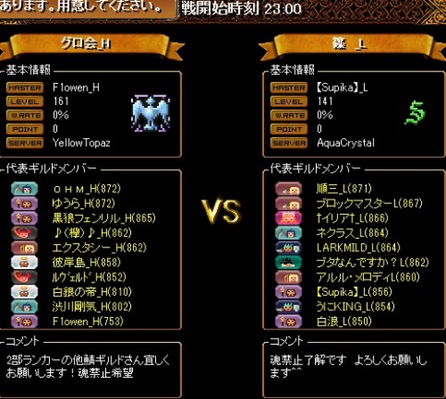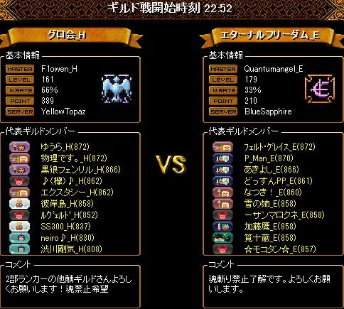 こちらの揃いは16名の8・8編成ですが2名ほど時間ギリギリでの転送だったので少し編成をしくじってしまいました。16人いても火力はいつものように2名ということで、先制点を取られないように、またこっちが先制してもその後も無茶な追撃などしないよう気をつけたため、多少の得点チャンスロスはありましたが、少ないチャンスをしっかりとものにしてくれたおかげでリードを伸ばすことが出来ました。対戦ありがとうございました!
