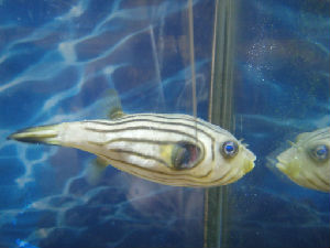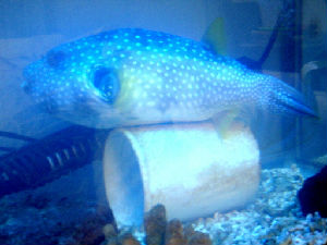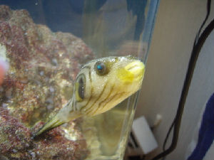 メイタイシガキフグのモナちゃんが死んでしまい、ナミヘイも白点病と戦っています。皆さん、励ましありがとう!ナミヘイは、まだご飯は食べませんが、すこし回復したような・・・?モナちゃんが死んだときは、ナミヘイもかなりやばそうでしたが、昨日ぐらいからすこし、顔色がいいというか泳いでいることが多くなりました。少しは銅治療がきいているのでしょうか。ナミヘイは、これまでも幾度もの危機を乗り越えてきたつわものです。今度もきっとがんばって生き延びてくれることでしょう!がんばれナミちゃん