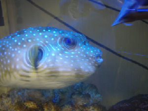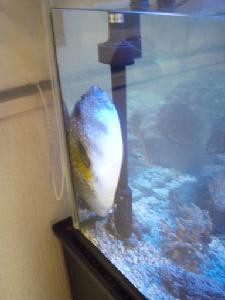 メイタイシガキフグのモナちゃんが死にました。原因は、白点病。淡水浴も、水替えも、銅治療もすべて後手に回ったため、なすすべもなく、どんどん弱っていき、真っ白になって死亡しました・・・。今、サザナミフグのナミヘイが、闘病中です。2週間もえさを食べていないのでやせてしまいました。銅治療を始めてから、ムナビレが、赤っぽくなってきました。充血しているのか・・・。末期かな・・・・・・。