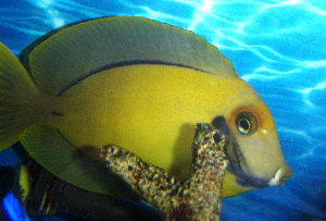 この子は、うちの水槽にいる、通称ミミックタン(ヘラルドヤッコに擬態しているハギです)。本名は「クログチニザ」。ペットショップでは、実際の名前と違う名前が通称になっていたりします。うちではなぜか「黄色いやつ」と呼ばれています・・・。差別だ~と思う人もいるかもですね。だってこのこ、性格悪いんです。ほかの魚をつついたり追いかけたりするし、餌もがつがつ食べて、ほかのこの餌もなんでも食べちゃうし。ほんとは ミミー って名前だったんだけど、いつの間にかこんな呼ばれ方に。しかも成長がはやくて。今は水槽に合わせて成長が止まりましたが、13cmくらいです。
