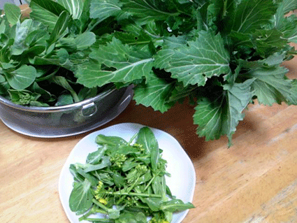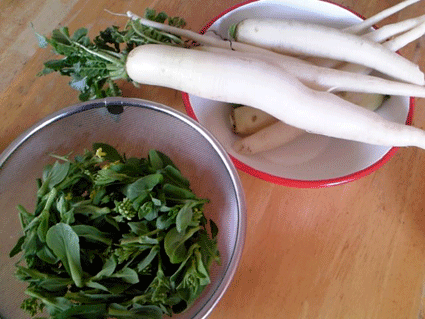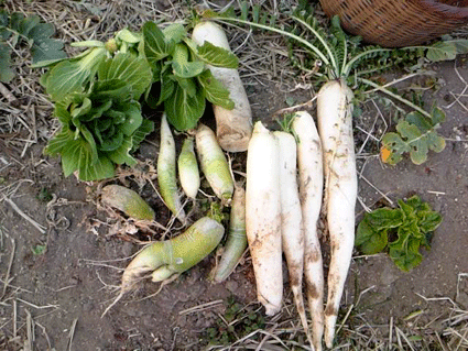 ダイコンの収穫もそろそろ終わりです。菜の花はおひたしにしようかな、雨も降ったし暖かくなったので、そろそろ土筆が出てるかな?といつもの土手に行ってみましたが、未だ少し早い様です。これだけ収穫して来ました。量が少ないので、みそ汁に入れて季節を味わう事にしました。雨が降ったのでアーティチョークも元気を取り戻した様です。頂いたルッコラは食べ方が解らないなぁ・・と思っているうちに花になってしまいました。飾って楽しむ事にします。今日は種まきをしようと外に出たのですが、風が強く花粉症で目は痒くなるし・・・せっかくの農作業に良い季節になったのにです。