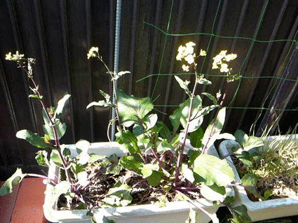 プランターに植えていたコウサイタイも一気に花になってしまいました。サンチュも元気よく育っています、このプランターの中には生ゴミと「土耕菌ナルナル」が入ってます。どうなるかな?隣のプランターには,植えた覚えの無いだいこんの葉っぱの様なのが育ってます、冬の間に縮こまってた水菜も一気に元気になっています。家の周りでは木々の芽も一気に吹き出そうとして膨らんでいるし,ネコもうるさいし~春が押し寄せようとしています