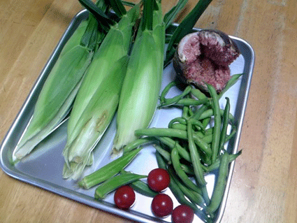 今日の収穫は,トウモロコシ、オクラ、トマト、インゲン、イチジクでした。トウモロコシは甘くておいしかったですでも,所々歯抜け・・・これは受粉の問題でしょうか?イチジクは,長雨のせいで熟れる前に次々開いてしまってます。大きいだけに,残念!