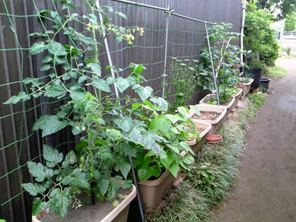 家の外にもプランター栽培を始めました。今年は初めてアスカマンを使ったせいか、みんな元気が良いです。さやいんげんも元気いっぱいに花を咲かせてます。フルーツトマトも実をいっぱい付けています。去年はカルシウム欠でトマトのおしりがただれてしまったけど今年はどうかなぁ?キュウリも全部芽を出したので間引かないといけないけどこのプランターだったら2個位しか植えられないかな?巨大なプランターではダイコンがすくすくでも、もっと間引かないといけないかな?