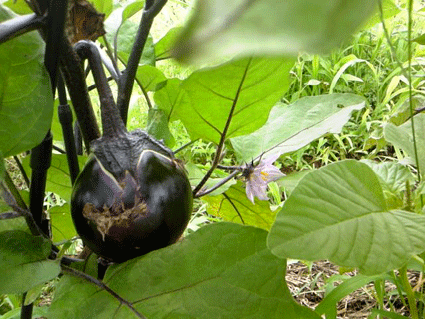 ちょっと見ない間に丸いなすもいくつか出来ていました。小さな植木鉢で育ったせいか,変な形のヒマワリが咲きました。何だか文句を言ってる口に見えますビニール袋の中でも野菜は元気に育ってます今年は種から育てたトウモロコシが育って,いくつか収穫出来そうです