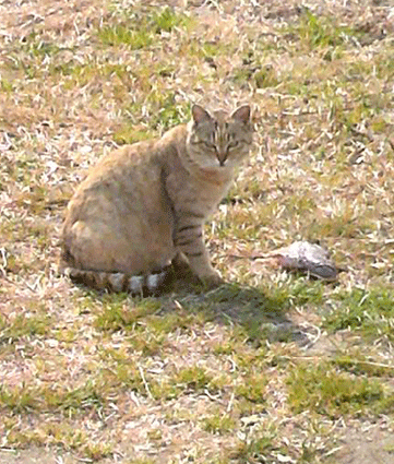 港のそばでノラ猫が魚の頭を前にして座っていました。カメラを向けると「何見てんのよ!」って表情です。漁師さんからよく魚を貰っているのですが,この頭の大きさは・・・盗んだのかも知れませんたまに魚を加えたネコが船から岸へジャンプする姿を見かけたりします今日は長らくさぼってた畑に種まきをしました。さやいんげんとジャガイモです。一年も期限が過ぎたホウレンソウの種を蒔いていましたが結構芽が出てました庭のさくらも花咲いて・・・サクランボが出来るんですよー♪それにしても,カリフラワーは黒くなって・・復活するのでしょうか・・・