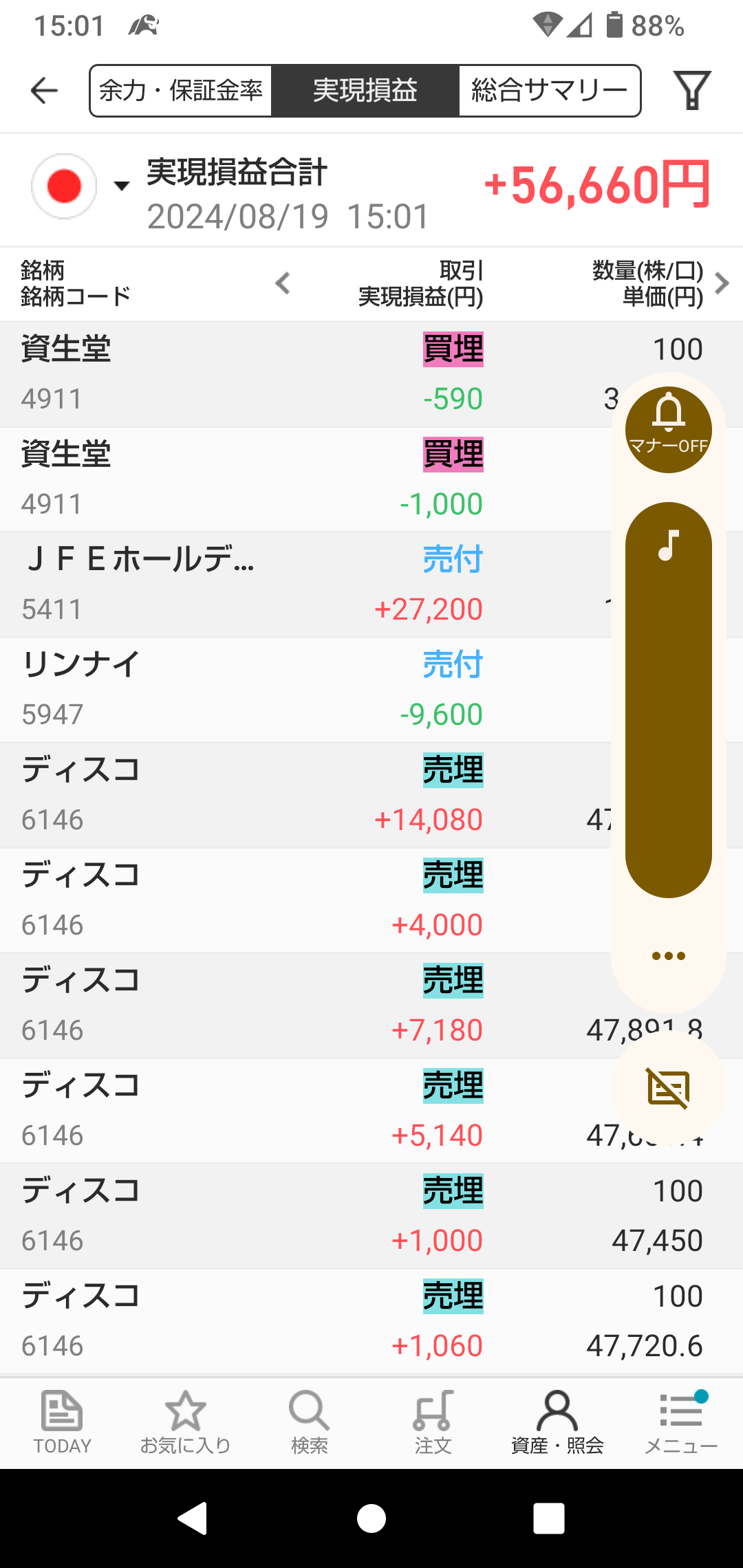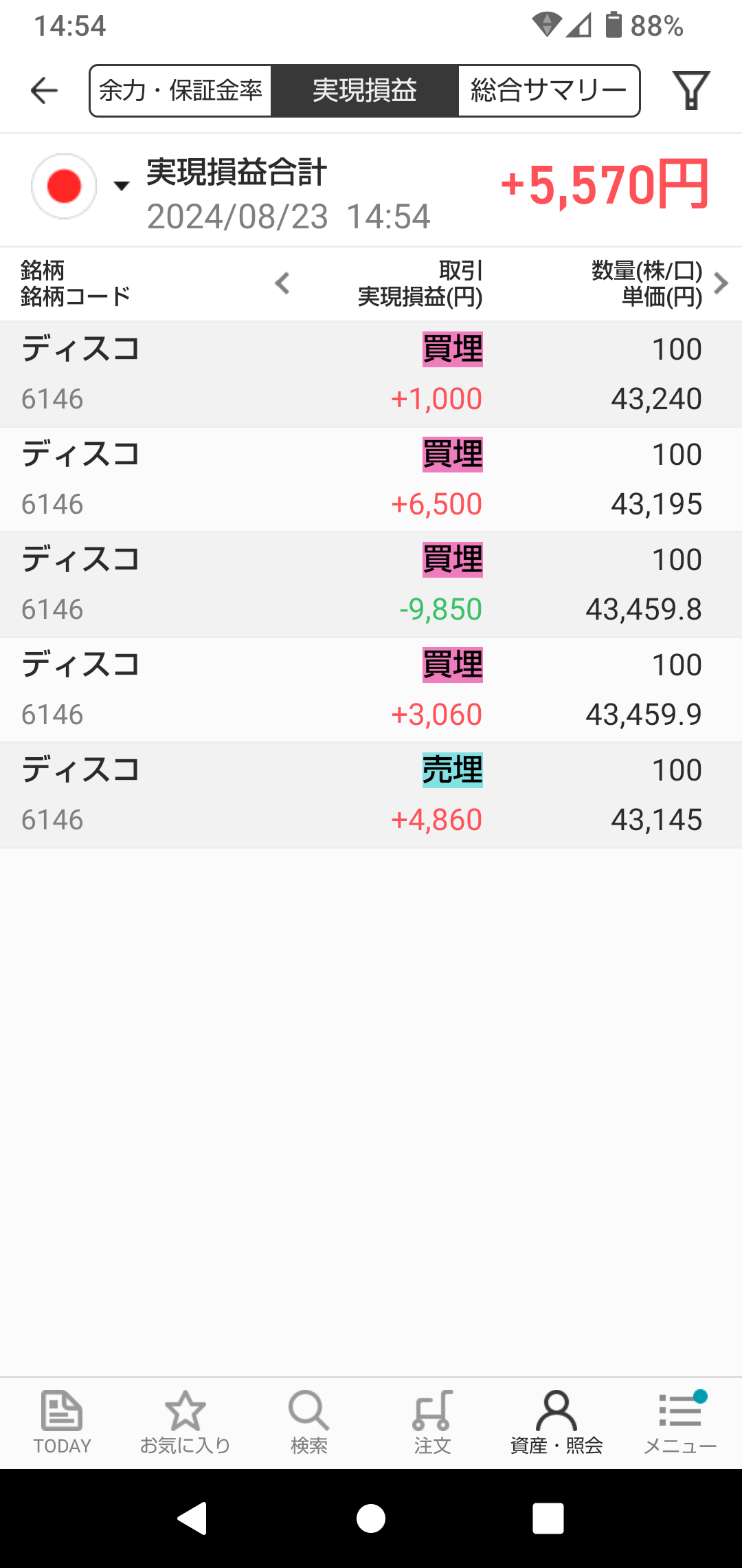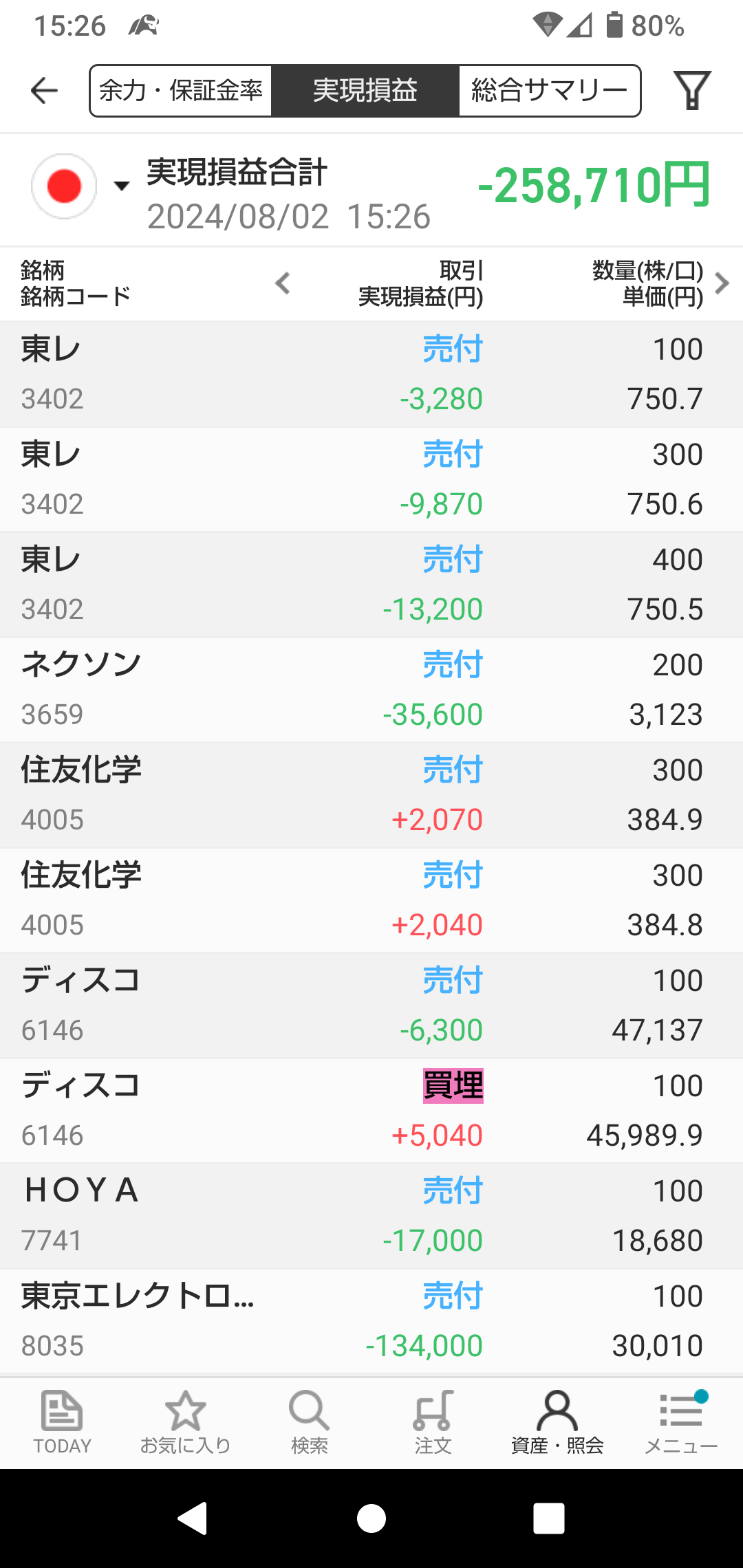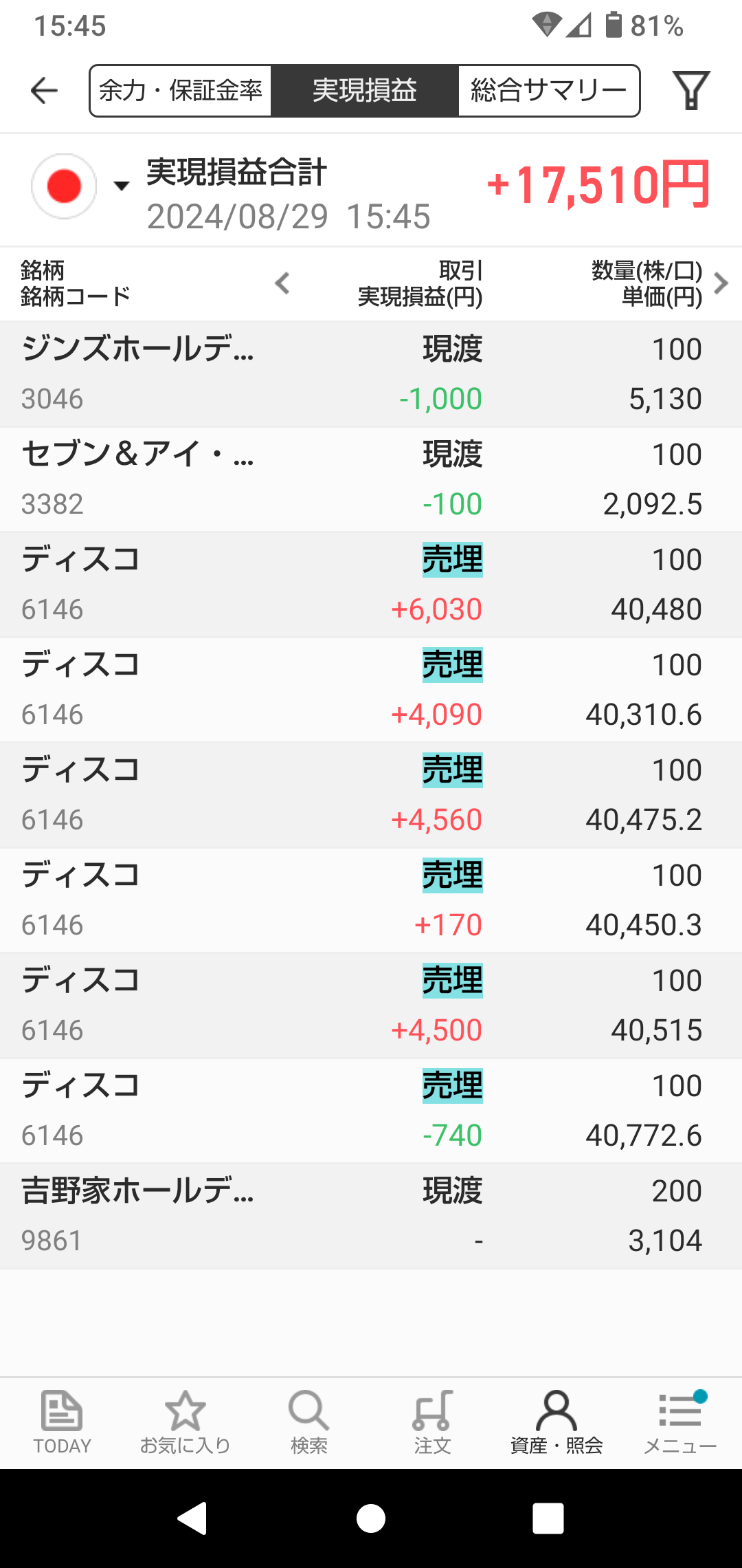 本日もトレード終わりました。実現損益プラス930円本日もディスコのデイトレードとスイング銘柄を触りました。スイング銘柄については、損切りラインになったので売りました。昨日買った住友化学、DNAです。本日のデイトレードの反省点インするときに思い切りがない ストップロス(損切りライン)を決めてない為だと思うので、ストップロス地点をきめる。エントリータイミングは、悪くないが利確地点まで待つ、怖いタイミングで入ることが大事かもしれない。半導体が後場にかけて買い戻しされていたので、エヌビディアの決算であがると考えられているのだと思う。どうなるかなーあと本日は、8月権利確定日ということで優待銘柄クロスしました。吉野家、セブンイレブン、JINSです。逆日歩たくさんとられないといいな。明日は、デイトレードに今日よりも注力してやりたい。明日も楽しみたい。
