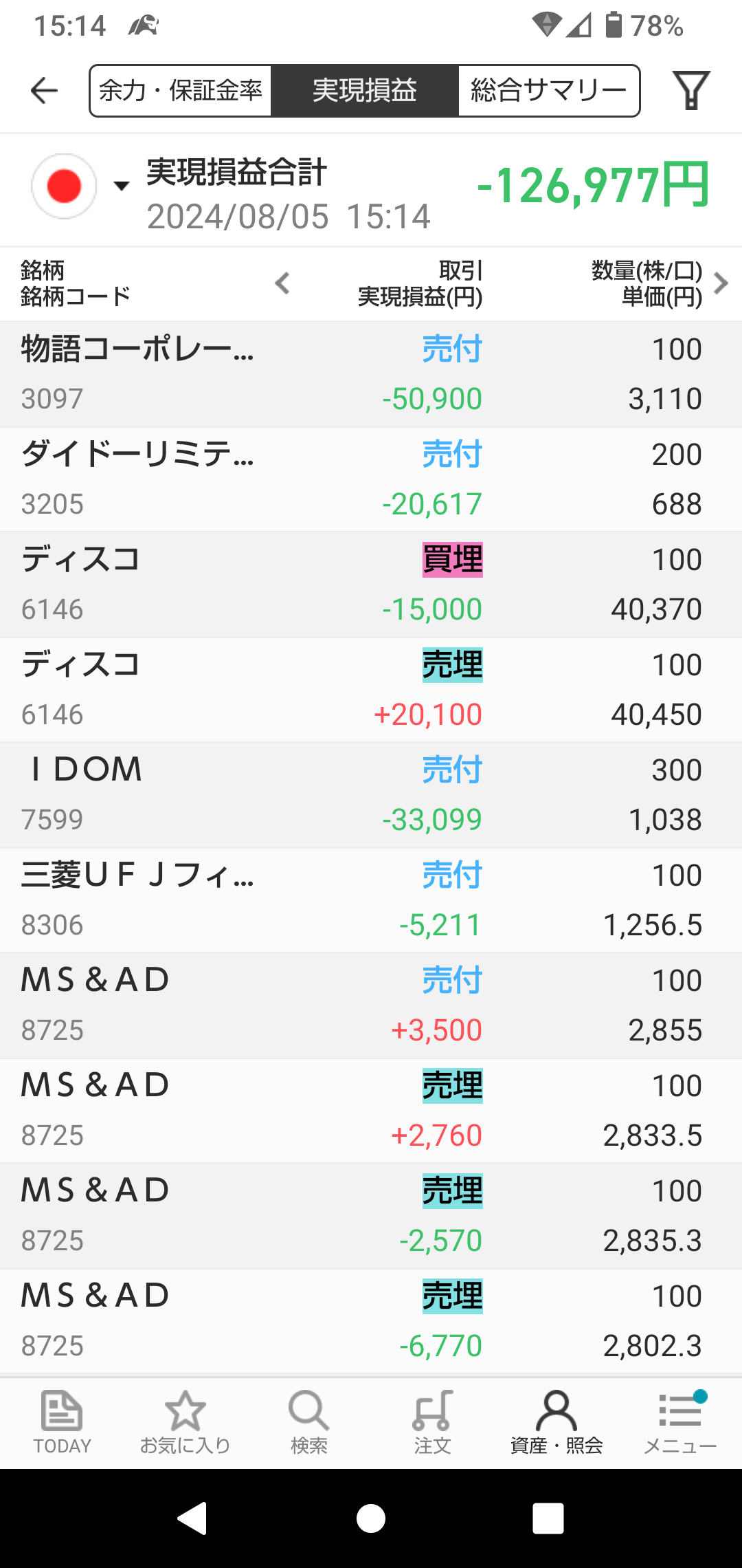 本日もトレード終わりました。実現損益マイナス122040円今日は、大負けしました。レーザーテックでデイトレードをしました。空売りの踏み上げをくらい大負けしました。入るタイミング等いろいろな指標を見て入ることを挑戦していきたい。今日の敗けが明日にいかせるようにしたい。配当銘柄の配当日までの上げ狙いでIDOMと日立建機をかいました。