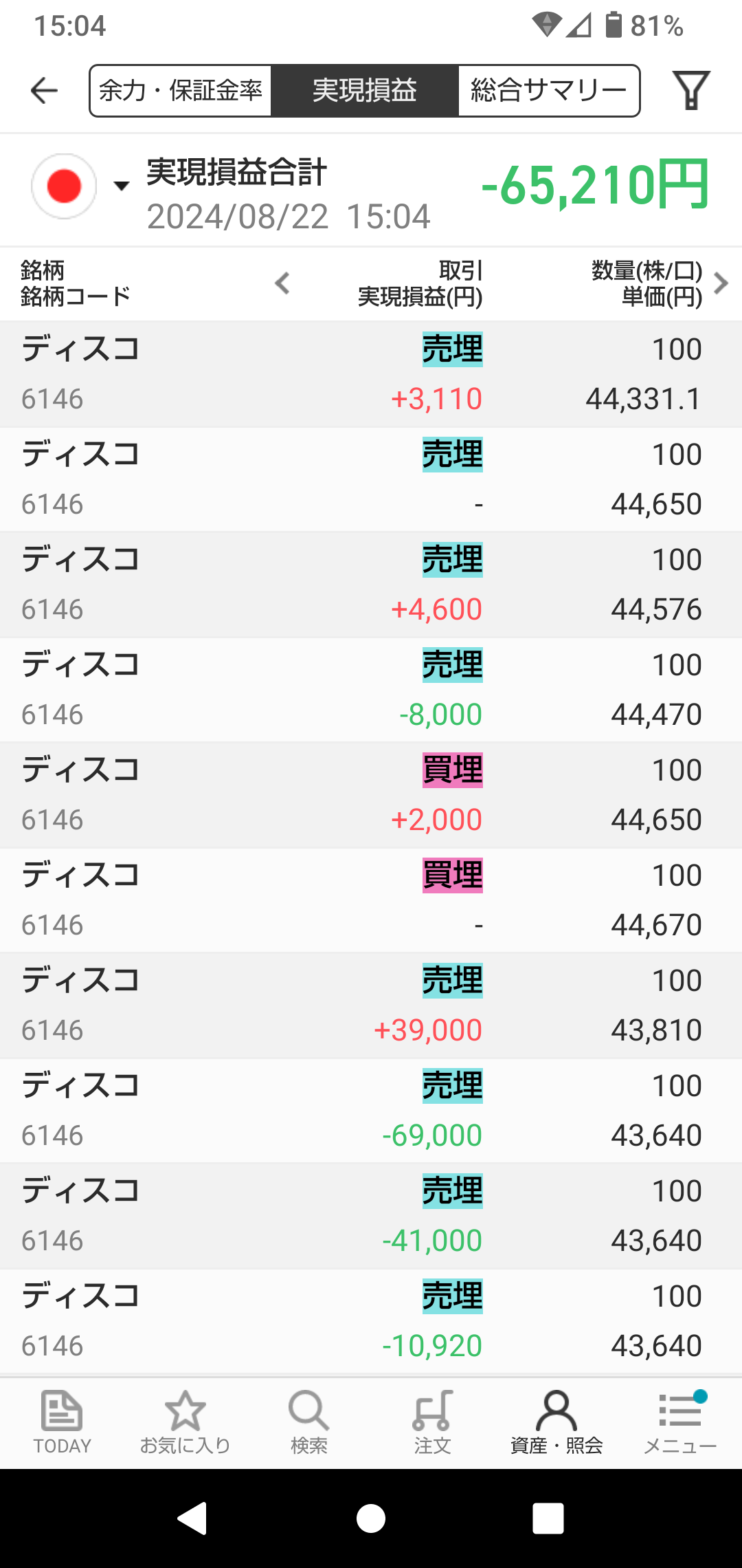 本日もトレード終わりました。実現損益プラス40819円本日もボラの大きな1日でした。トレードのプラスはデイトレードであがりました。銘柄は、ディスコや決算の銘柄等です。暴落もあり今月かなりマイナスなのでコツコツ勝っていけたらと思います。現在のようなボラが大きい相場だとスイングで持つのもつらいので、デイトレードもしていこうと考えています。両方やっていければと思います。