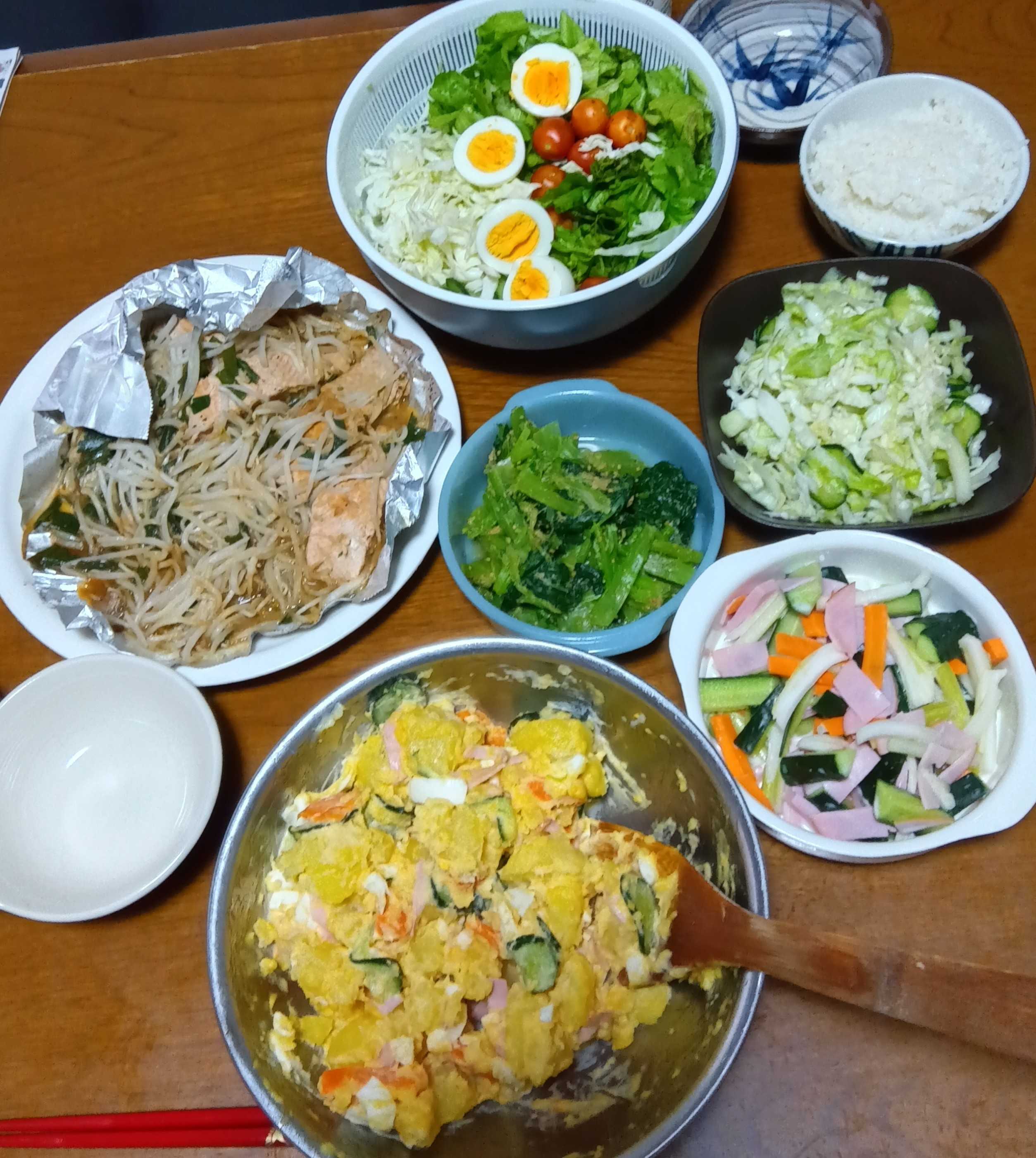 今日は早めに夕飯の支度をしました。結構手間がかかるメニューよ。じゃが芋早く食べないとーと思い、ポテトサラダ。セロリのサラダはサウザンドレッシング。キャベツきゅうりの酢漬け小松菜の胡麻和え生野菜生鮭は美味しい。バター 味噌 酒 で味付け。もやしニラ椎茸をどっさりとね。茹で玉子2個入れたからコクがあるわ。味付けは薄め。1日中雨だわ。眠いから、早く寝ましょう。鮭 秋鮭切身 切り身4切れ 生鮭 越後村上うおや 村上市 新潟県【楽天ランキング入賞★アレンジいろいろ!業務用 ポテトサラダ】いもさら 1kg十勝産 大容量 惣菜 おかず お弁当 サラダ いもサラダ じゃがいも 副菜 チルド 冷蔵 パーティー プロ 飲食店 洋食 クリスマス 給食 大量調理 外食 定食 北海道産 じゃがいも