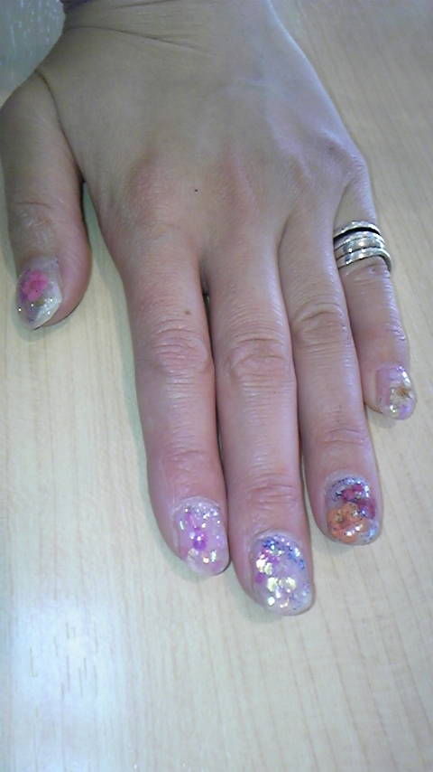 桜の季節に合わせて押し花がちりばめてあります。最近はジェルネイルを自分でやっています。自分の思い通りに出来る反面、右手はやりずらいっす。なので、左手だけお見せしますね。 最初の慣れないうちははずれてしまったりしましたが、慣れると三週間から一ヶ月位持ちます。私の場合、持ちというより飽きるほうが問題だったりします