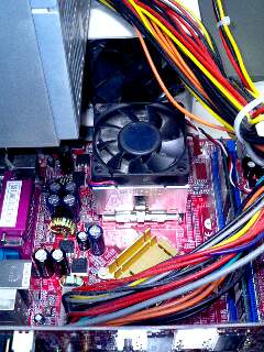 パソコンのケースを開けたことありますか?昔からこういう電気製品って好きだったんですよ。ビデオとか調子悪かったらよくあけてた記憶があります。大学はいってそっち系の学部に進んだのもやっぱりなるべくしてなったんだと思います。さて、今回は少し専門的な話になりますが、最近パソコンの調子が悪くて結構困っておりました。具体的な症状としては処理が急に重くなったり、ちょっとハードな処理をするといきなりパソコンが再起動したり。ソフトとかの相性とかの問題かなと思ったのですが、何の前触れも無く落ちたりするので結構お手上げでした。最近色々調べてると熱暴走と言う疑いが出てきました。これはパソコンが以上に熱くなって中の部品がおかしな動きをするというものです。パソコンの温度を測るソフトで調べた結果、CPU温度が70度を超えていることに気がつきました。これはやばいわなと思ってCPUを冷やす方法を探すことに。そんなにお金をかける気も無いのでCPUに塗るシリコングリスと言うのを買ってきました。パソコンのケースを開けるといろんな部品が出てきます。こんな感じ。CPUってのはパソコンの頭脳みたいなもので、一番重要な部品でもあります。これを冷やすのは上に載せる扇風機で、この扇風機とCPUが接触する部分に買ってきたシリコングリスを塗ります。グリスを塗るために扇風機を取ってみました。すると・・・ものすごいほこりが部品の隙間に詰まっていました。温度が上がったのはこれのせいじゃないかと思いながら掃除機でほこりを吸いました。グリスを塗って扇風機を元に戻し、ケースを元に戻してるときに、ケースにもすごいほこりが詰まってるのを見つけました。これじゃ通気性も悪くて温度も上がります。きれいに掃除して温度を測ったら温度が20度くらい下がりました。多分これは1年以上たまったほこりが原因だな・・・そう思いました。たまには掃除も必要です。パソコンの調子が悪くなったら掃除をして見ましょう。