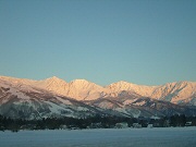 写真は今朝の白馬三山。中央の3つのピークが左から白馬鑓ヶ岳、杓子岳、白馬岳です。一番高いのが白馬(しろうま)岳です。村は「はくば」ですが山は「しろうま」ですよ。