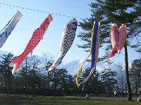 グリーンスポーツの森にはこいのぼりが上がっていました。北アルプスをバックに泳いでいます。近くの平川にもこいのぼりが泳ぎます。こちら(平川)の方がカメラマンには人気です。