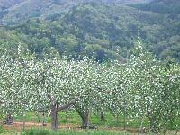 写真はりんごの花です。遠くから見ると新緑と供にかすみが掛かったように見えてきれいでしたよ。