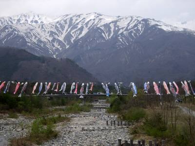 昨日から3日間、塩の道祭り。毎年5月3日は小谷村、4日が白馬村、5日が大町市です。平川に架かるこいのぼり。天気は下り坂ですがまだ山の稜線が見えていました。白馬村のコースのゴールはグリーンスポーツの森。写真はゴール近くの平川。スタートは青木湖畔と落倉の2ヶ所が一年交互です。ゴールは毎年グリーンスポーツの森。普段は人影ないグリーンスポーツの森ですが今日は大勢の人で大賑わい。