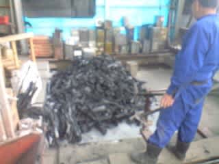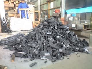 いったん全部の炭をコンクリート床に移して、二人がかりで
