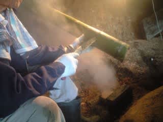 昨日とりつけた竹の煙突の元側をのこぎりで一部欠き煙が入る構造にします。