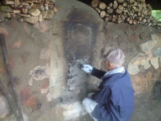 昨日まで小さな穴だけ開けて、ほぼ塞いでいた窯口をすこしずつ広げて行きます。
