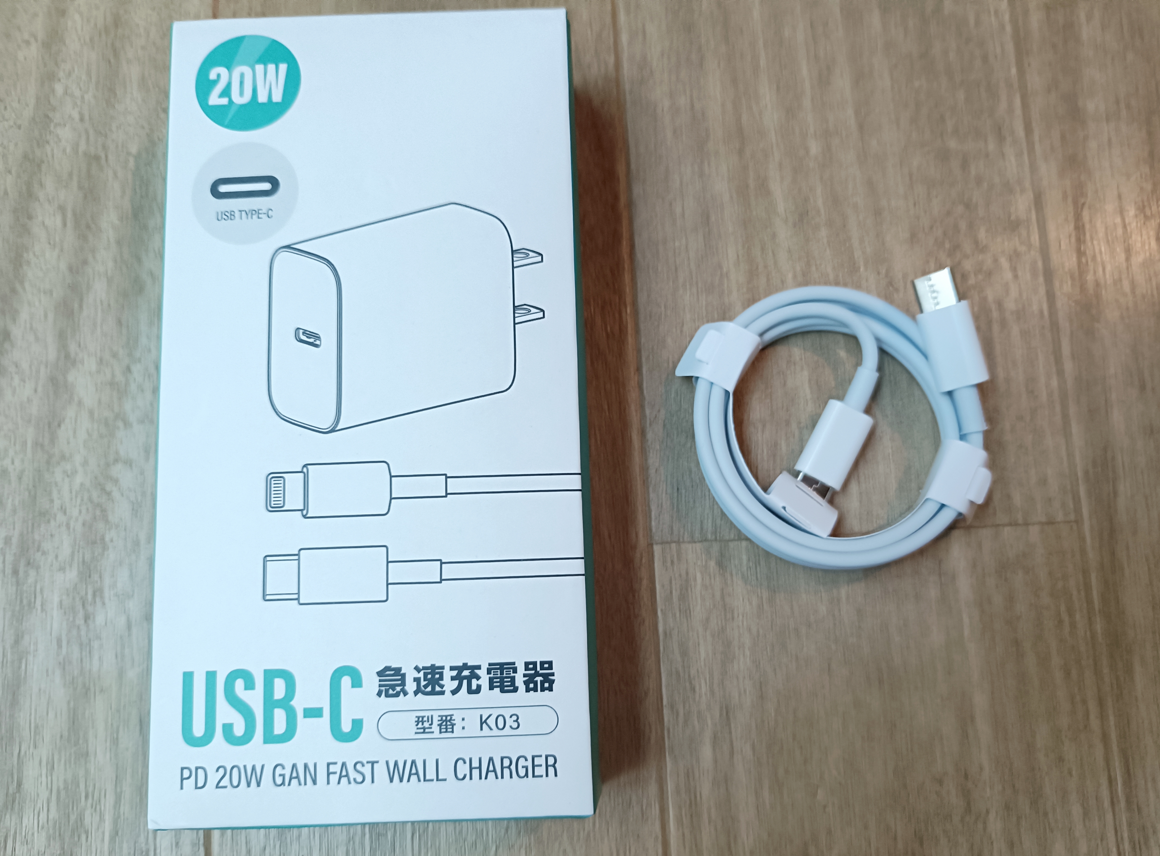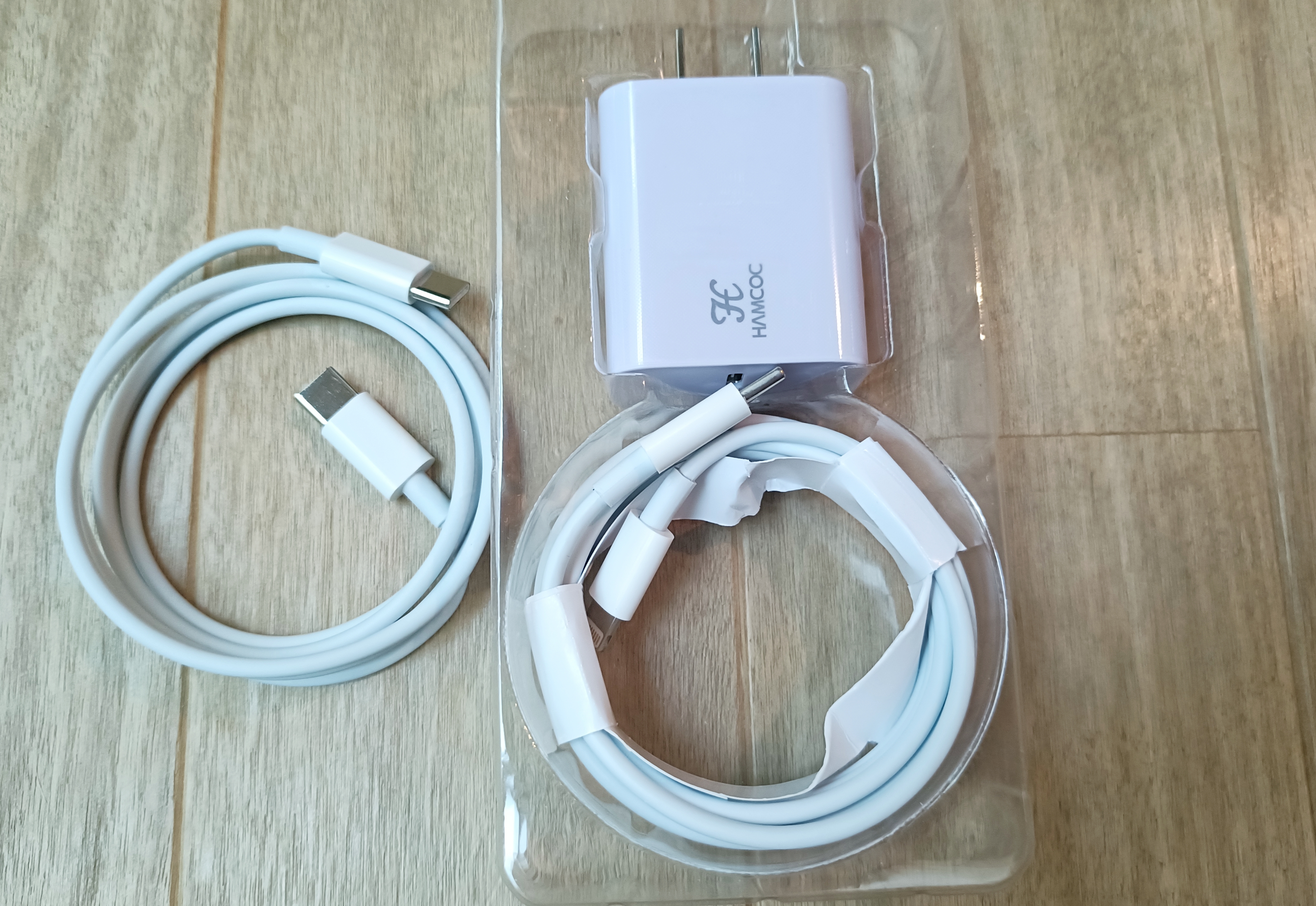 スマホ充電器、typeC to CとtypeC to Bの2タイプのコードつき。