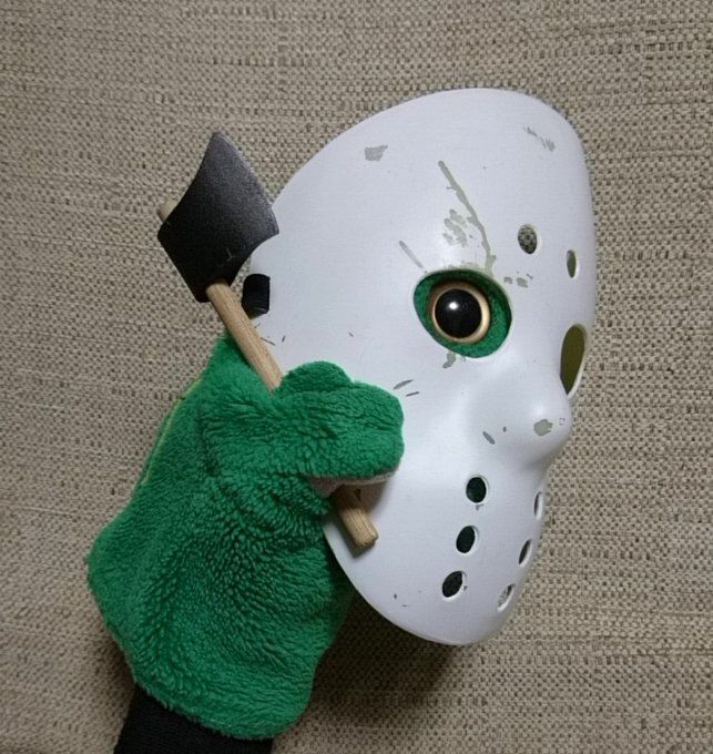 とコメント。パペットマペットのカエルくんがジェイソン風の仮面をつけ、斧を持った姿を映した写真を披露した。